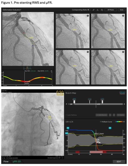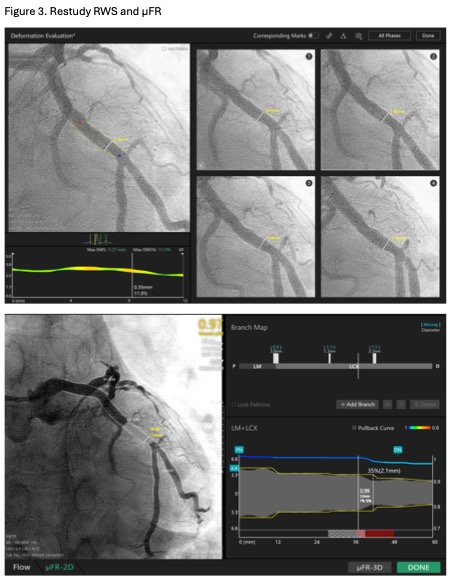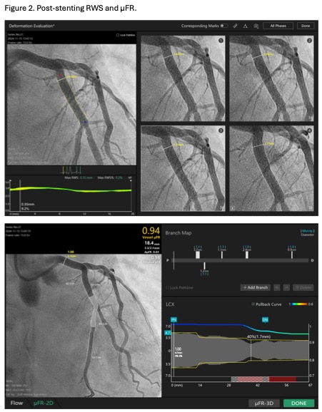 Coronary angiogram showed 90% stenosis of mid-LCX (Video 1). The maximum radial wall strain (RWS) was 26%, reflecting significant plaque vulnerability (>12%). Murray law-based quantitative flow ratio analysis (¥ìFR) was 0.50 (Figure 1), reflecting functional significance (<0.80). Optical coherence tomography (OCT) showed fibroatheroma with lipid arc of 270 degrees with mild calcification (Video 2). Overall, the findings were consistent with vulnerable plaque at mLCx.