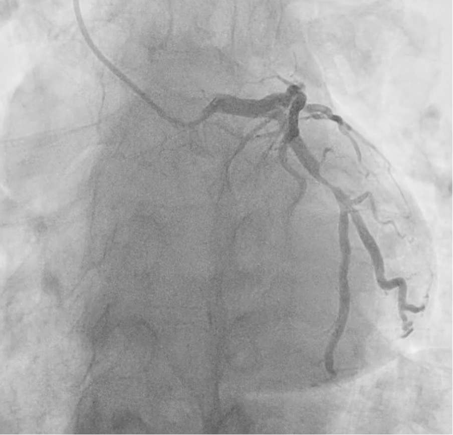 Computed Tomography (CT)-coronary angiogram revealed calcium score of 236, moderate atherosclerotic disease affecting all three coronary arteries, with severe stenosis at distal left circumflex artery (LCX). Electrocardiogram was unremarkable.