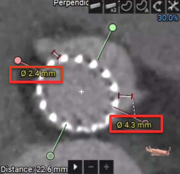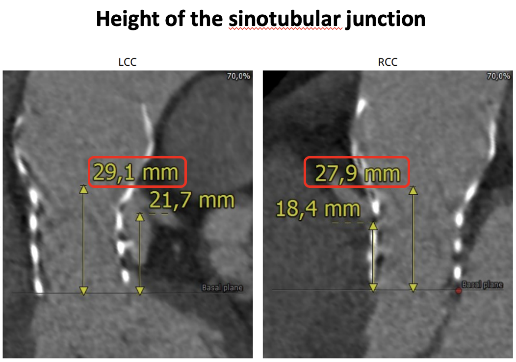 Multidetector CT was performed to assess the risk of coronary obstruction in the context of redo TAVI. The assessment focused on the spatial relationship between the neoskirt plane of the degenerated CoreValve and the coronary risk plane. The perimeter-derived annular diameter of failed CoreValve was 21.3 mm, guiding the selection of a 26-mm Evolut PRO valve. The narrowest valve-to-coronary distances measured 4.3 mm for the left main and 2.4 mm for the RCA.