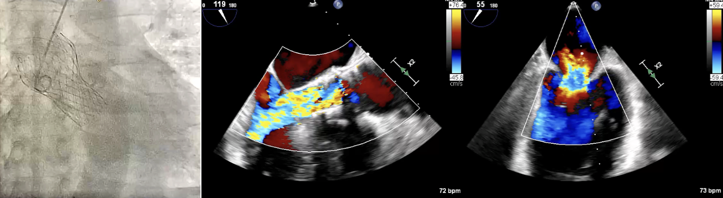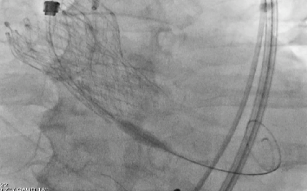 A 79-year-old male, who underwent TAVI with a 29 mm CoreValve in 2015, presented six years later with NYHA class III symptoms. Echocardiography showed Severe central AR and severe functional MR with Mean gradient: 12.4 mmHg; peak gradient: 23.3 mmHg, AVA: 1.4cm2 and LVEF: 61%. EuroSCORE II was 7.00% and STS score was 3.060%