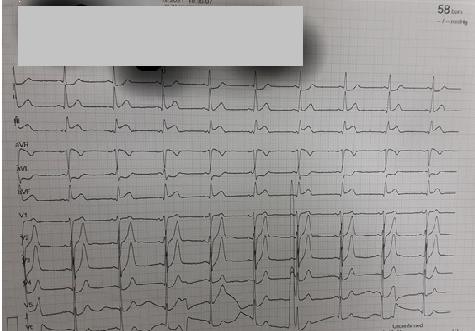 Patient admitted in our hospital, with chest pain 2 hours before admission. On physical examination BP 110/70, hr-60 bpm. Patient is a smoker, and have a positive family history for coronary artery disease.EKG on admission :