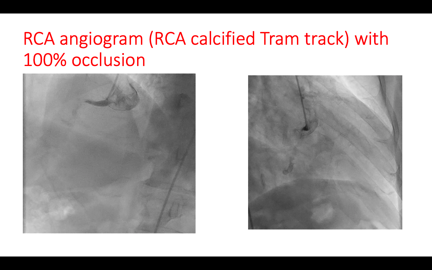 Angiogram suggestive of patent stents in LAD and LCX; and dominant right coronary artery with proximal cut off along with tram track calcification. The RCA is filling distally by retrograde collaterals Rentrop III.