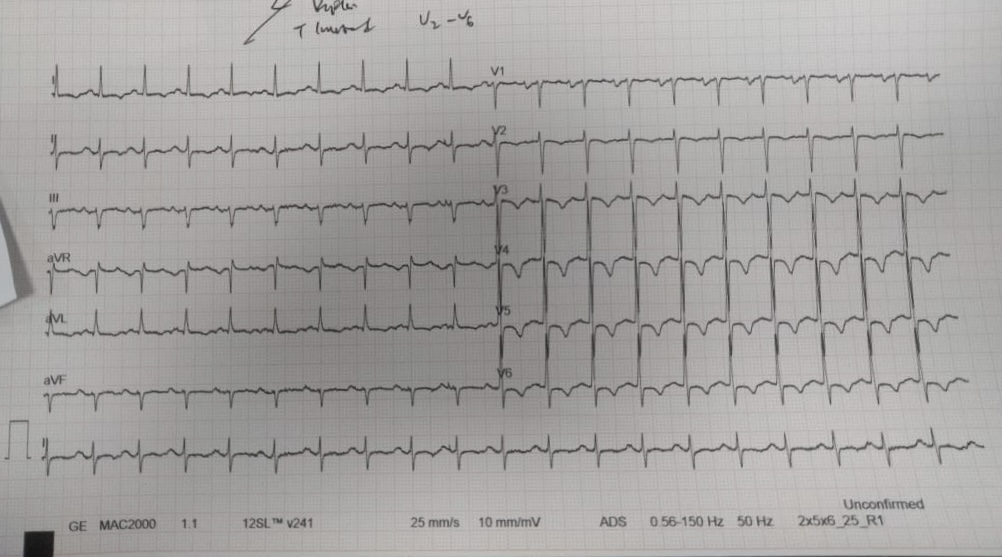 ECG showed 1–2 mm ST depression with T-wave inversion in leads V3–V6, consistent with anterior ischemia. High-sensitivity troponin I was elevated at 1.2 ng/mL and rising. Chest X-ray was normal. Echocardiography showed mild LV systolic dysfunction (EF 50%) with anterior hypokinesia. Renal function and electrolytes were within normal limits.