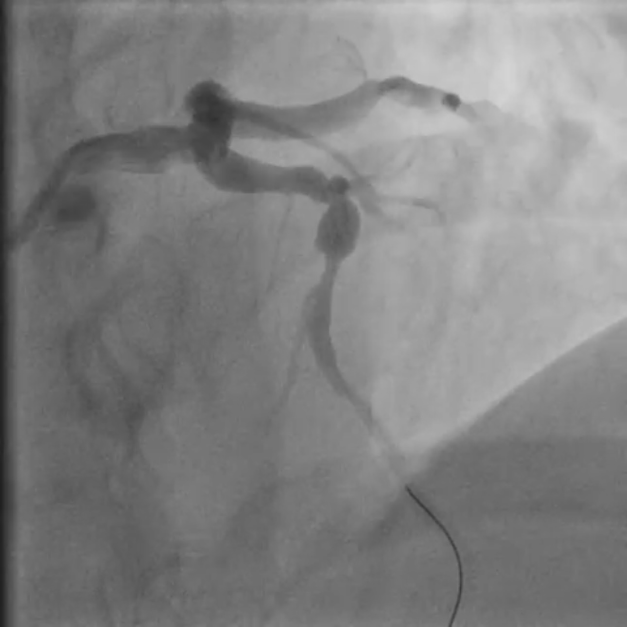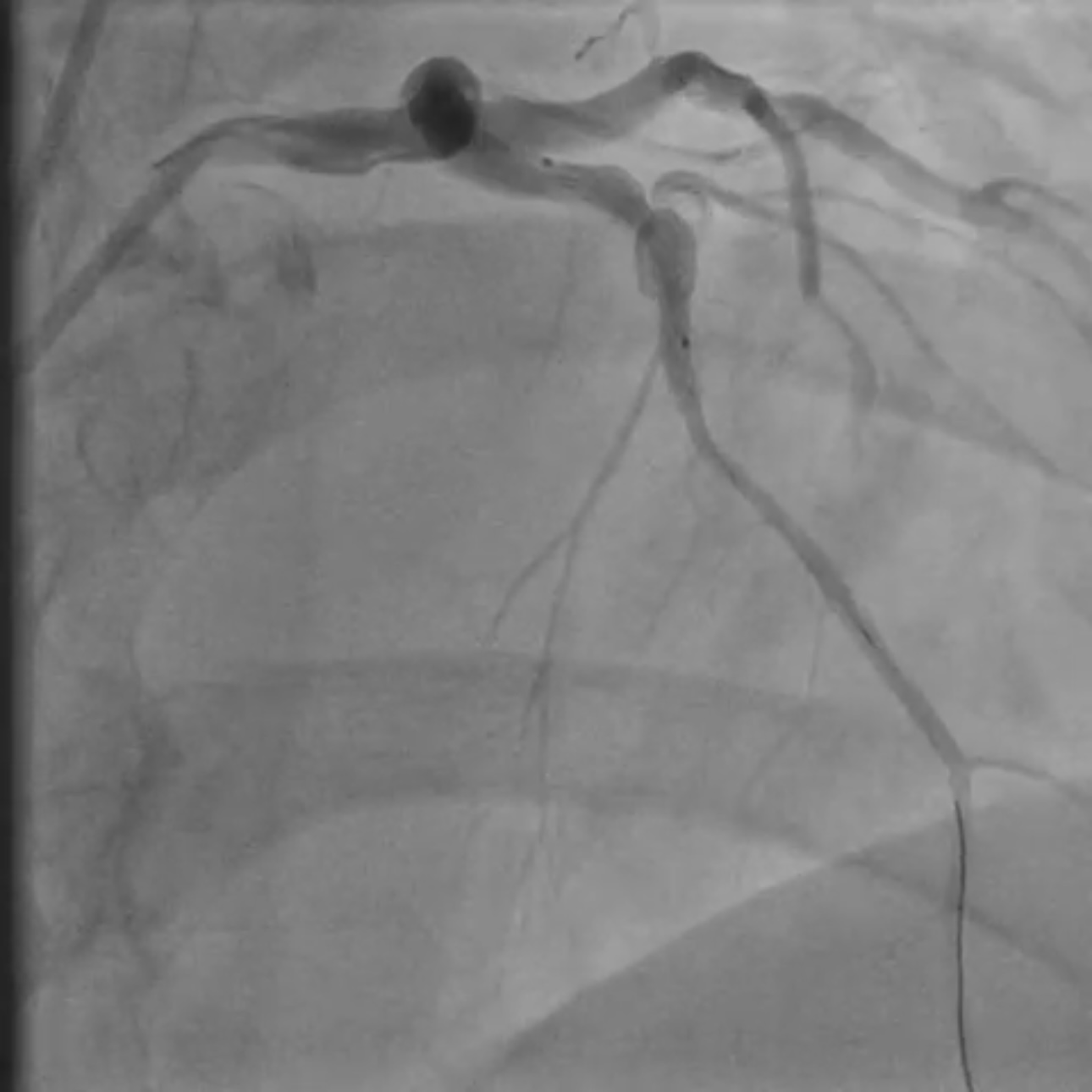 Coronary angiography revealed two critical stenoses in the mid–left anterior descending (LAD) artery separated by a short fusiform aneurysmal segment. A diagonal branch originated near the proximal aneurysm margin. Implanting a covered stent was avoided due to the high risk of diagonal branch occlusion, and a drug-eluting balloon (DEB) strategy was rejected because it offered no vessel scaffolding and could destabilize the aneurysmal wall. A dual drug-eluting stent (DES) bridging technique was selected to stabilize the aneurysmal segment while maintaining branch perfusion. The procedure was performed via right radial access using a 6F XB guide catheter for enhanced support. A floppy guidewire was advanced into the distal LAD. Lesion preparation was performed with a 2.5 mm semi-compliant balloon. A 3.0 ¡¿ 15 mm DES was first deployed distally to treat the distal stenosis and establish a stable anchoring platform on healthy vessel. A second DES (3.5 ¡¿ 22 mm) was then implanted across the aneurysmal segment, with distal overlap onto the first stent to secure the construct outside the aneurysm. The proximal landing zone was carefully positioned in healthy vessel proximal to the aneurysm. Post-dilatation was deliberately limited to the landing zones with a non-compliant balloon to minimize mechanical stress on the aneurysmal wall. Final angiography showed optimal stent expansion, preserved flow to the diagonal branch, no dissection or perforation, and TIMI 3 flow. The patient received unfractionated heparin during PCI and dual antiplatelet therapy (aspirin + ticagrelor) per ACS guidelines.