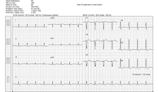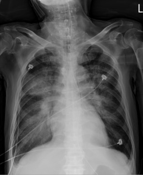 The Laboratory data revealed elevated NTproBNP(>70000 pg/ml) and Troponin-I level (32 ng/ml). Pulmonary edema was noted on Chest X-ray (picture as above). The electrocardiogram (ECG) which showed normal sinus rhythm without obvious ST segment elevation. Non-ST-Elevation Myocardial Infarction was diagnosed.