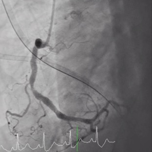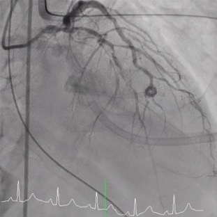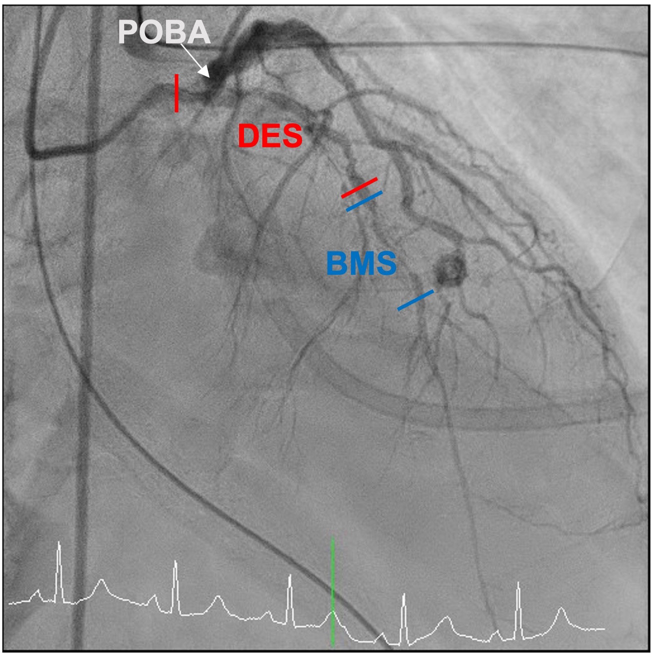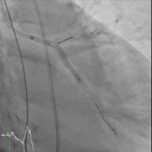 Coronary angiography(CAG) was done and showed Right Coronary artery(RCA) segment 2 70% stenosis, 75% stenosis at distal Left Main coronary artery(LM) and 90% stenosis at middle Left Anterior Descending artery (LAD), along with a 90% stenosis at the Left Circumflex artery (LCX) orifice. Due to the patient could only afford one Drug-Eluting Stent(DES), so our initial strategy: a Bare-Metal Stent(BMS) at the middle part of LAD and one DES stent crossing over LM-LAD with final kissing.