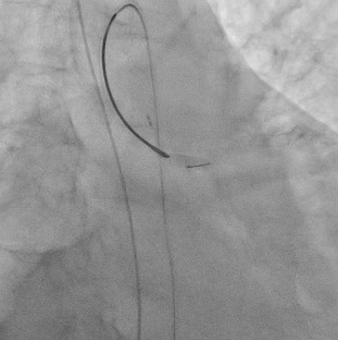Percutaneous coronary intervention (PCI) was initiated by a right femoral approach using a 7 Fr EBU 3.5 guide catheter. We started from NC balloon and cutting balloon for lesion preparation, then first BMS was deployed successfully but the 3.5 X 48mm DES was hard to push even by side branch and distal anchor technique. We changed our strategy from 1 long stent to 2 shorter stent with a shorter DES and it work. But, due to the jailed LCX orifice, the reversed culotte technique was used with the opened 48mm DES at the beginning as bail out 2 stent strategy. We were able to deployed the opened 48mm DES at the LM-LCX successfully, however, the balloon could not be deflated and was stuck! We hurriedly tried the opened cutting balloon and back-and-forth traction but failed. Even worse, the balloon shaft snapped! We tried to engage the guiding to catch the balloon but failed again. Overall, this was a catastrophe with an un-deflated fractured balloon trapped and stuck at the left main coronary artery.The patient complained of severe chest pain accompanied by a dropping blood pressure. We administered Bosmin with Levophed pump for the shock status and contacted the Cardiovascular surgeon and ECMO team immediately. For our last resort, we tried the Snare to catch the proximal tip of the undeflated fractured balloon and finally we succeeded. We were able to capture the balloon and retrieve it, with the angiography resulted expanded stent with normal coronary flow.