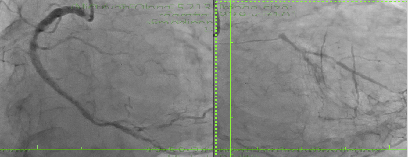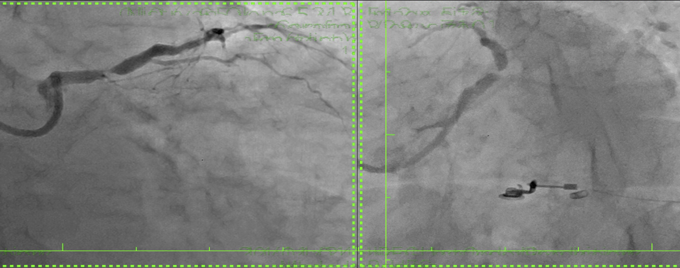 Same-day coronary angiography revealed diffuse disease in the right coronary artery providing collaterals to the LCx and LAD. A subocclusive distal left main stenosis extended into the LAD. Despite a high Syntax score (33) favoring bypass, the patient opted for percutaneous treatment. A key challenge was locating the LCx ostium, which was angiographically silent, with only a thin channel guiding the wire toward the LAD, complicating LCx access.