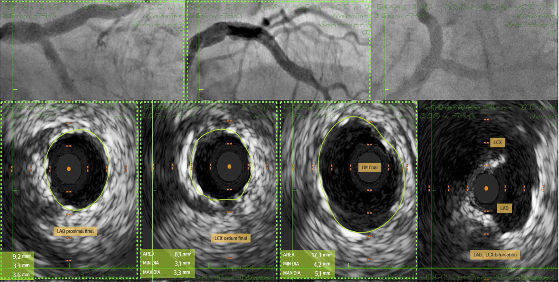 The procedure commenced with IABP insertion and the use of a 7F XB guiding catheter for an antegrade approach. A wire was advanced across the LM-LAD stenosis, and predilatation with a 2.5 mm semicompliant (SC) balloon revealed the faint ostium of the occluded LCx. A 45¡Æ angulated microcatheter facilitated the crossing of the LCx occlusion with a stiff wire, which was then exchanged for a standard workhorse wire.Following LCx predilatation, kissing balloon pre-dilation of the LM-LAD-LCx bifurcation was performed. A 3.0x18 mm Sirolimus stent was deployed in the proximal LAD. Subsequently, a 2.75x18 mm Sirolimus stent was placed in the LCx with minimal protrusion into the LM and crushed with a 3.5 mm non-compliant (NC) balloon. The crushed stent struts were recrossed, predilated with sequential SC balloons, and a distal optimization (DOT) was performed. A second kissing balloon inflation followed.A third Sirolimus stent (4.0x25 mm) was then overlapped with the previous stent in the LAD-LM segment. After a proximal optimization technique (POT) in the LM, the LCx was rewired. Final optimization included further DOT in both the LAD and LCx, a final triple kissing balloon inflation, and a concluding POT. An excellent final result was confirmed by IVUS (LAD area 9.2 mm©÷; LCx area 8.1 mm©÷; minimal lumen area 16 mm©÷) and angiography, after which the IABP was removed.