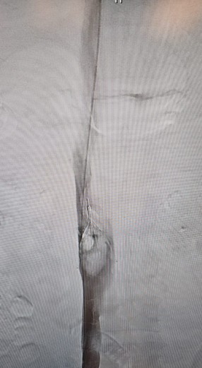 Right internal jugular vein (IJV) and popliteal vein large bore access was obtained with a 14Fr sheath and a 16Fr ClotTriever sheath respectively. Initial venogram showed extensive thrombosis from the below knee popliteal vein to the IVC filter with flow stasis of the intravenous contrast.