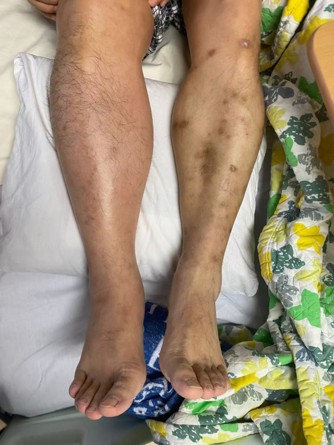 A 55-year-old Chinese male with an underlying anti-phospholipid syndrome and prior left leg DVT on warfarin had an IVC filter implanted prior to a radical resection of the perineal sarcoma. Two weeks after the surgery, an IVC filter removal was attempted but thrombus was found at the filter. It was decided to leave the filter and continue with anticoagulation. However, 2 weeks further on, he presented with a progressive right lower limb swelling, erythema and pain which worsened despite warfarin