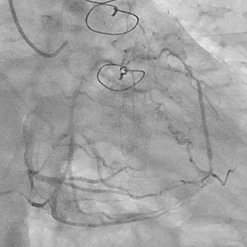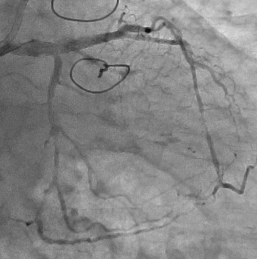 The patient was a 70-year-old man with a history of PCI to the right coronary artery and coronary artery bypass grafting using the Left Internal Thoracic Artery to the Left Anterior Descending artery (LITA–LAD). He had been stable on medical therapy, but developed exertional chest pain three months earlier. Despite medication adjustments, his symptoms gradually worsened, reaching Canadian Cardiovascular Society class II. The electrocardiogram showed nonspecific ST–T changes.