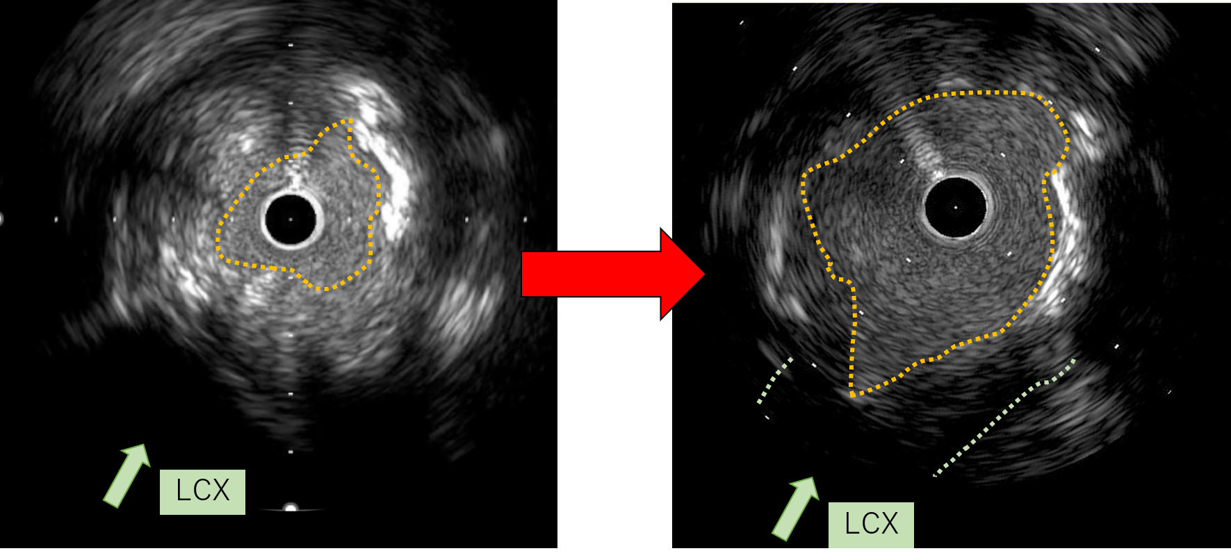 First, percutaneous coronary intervention (PCI) was performed toward the left anterior descending artery (LAD). The initial antegrade wire deviated from the true lumen; therefore, parallel wire technique was employed to achieve successful crossing. To avoid jailing the left circumflex artery (LCX) ostium, the stent was deployed precisely at the LAD ostium, and the left main trunk (LMT) was dilated using a 4.0-mm cutting balloon. One month later, intervention toward the LCX was undertaken. Intravascular ultrasound (IVUS) performed from the LAD confirmed achronic total occlusion (CTO) entry with a markedly thick plaque covering the LCX ostium. Although the lesion was accurately marked, penetration with a high-penetration guidewire was unsuccessful. Even with the balloon screen technique using a CP 8-20, wire penetration remained unsuccessful. Therefore, plaque debulking was selected to expose the CTO entry. Directional coronary atherectomy (DCA) was performed, and follow-up IVUS demonstrated significant plaquethinning compared with baseline. Subsequently, the CP 8-20 wire advanced smoothly, enabling successful wire crossing. The procedure was completed usinga mini-crush stenting strategy.