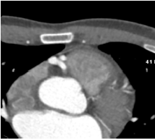 A 40-year-old man presented to the ER with 4 months of progressive dyspnea on exertion and bilateral lower-extremity pitting edema. He had no medical history. EKG-gated computed tomography revealed reduced ejection fraction and a large right coronary artery–to–pulmonary artery fistula. Diuretics improved his symptoms. Examination showed a pansystolic murmur at the left upper sternal border and 1+ pitting edema. He was referred to our hospital for fistula and heart failure management.