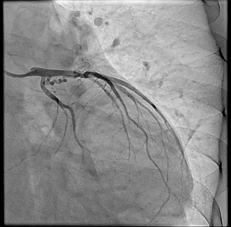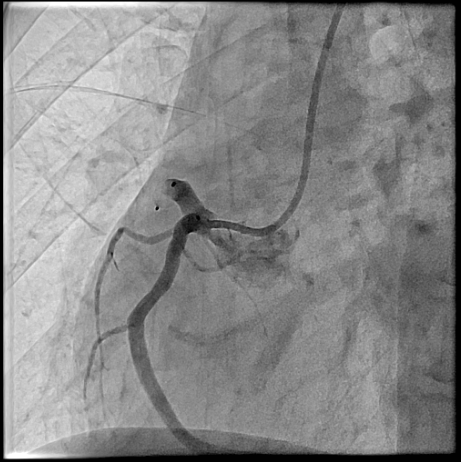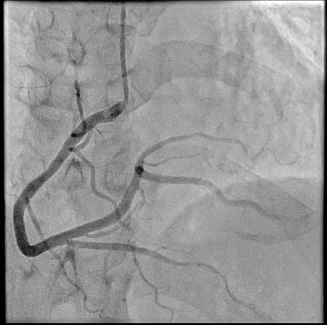 Right heart catheterization revealed a pulmonary capillary wedge pressure of 19 mmHg and mean pulmonary artery pressure of 47/27 mmHg. Pulmonary vascular resistance was 3.06 Wood units, with cardiac output of 4.9 L/min and Qp/Qs ratio of 1.24. Coronary angiography showed patent left main, LAD, and circumflex arteries. A small proximal LAD fistula and a large RCA fistula, both draining into the pulmonary artery, were identified.