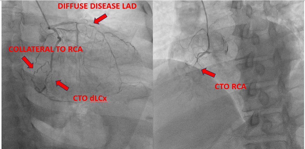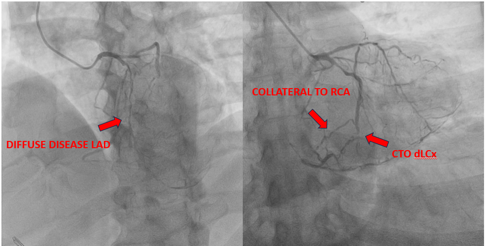 • The RCA was completely occluded, with collateral flow observed from the mid LCx to the RCA.