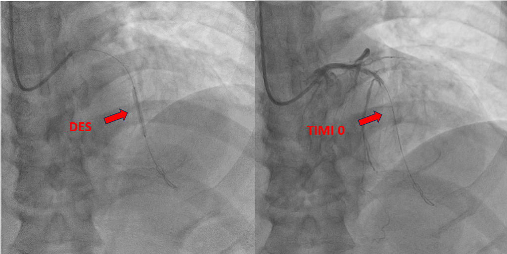 A 62-year-old Malay male, active smoker, diabetic mellitus, dyslipidemia, ischemic heart disease presented with unstable angina. Previous month Myocardial perfusion scan showed infarction involving the RCA and LCx territories. He was scheduled for emergency coronary angiography. Clinically, the patient had resolved chest pain, haemodynamically stable. Cardiovascular examination revealed a dual rhythm with no murmurs, and pulmonary examination showed equal.