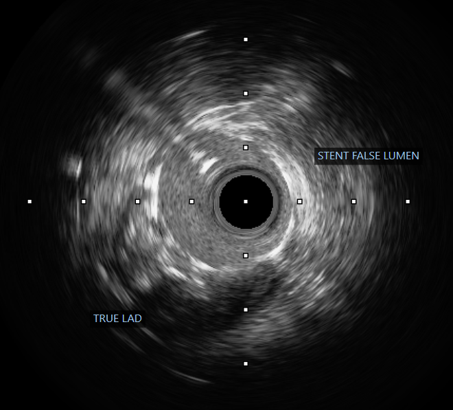 The procedure was performed via a 6 French femoral approach. The LAD was wired using a BMW guidewire and pre-dilated sequentially with non-compliant balloons sized 2.5 ¡¿ 15 mm and 3.0 ¡¿ 15 mm, achieving satisfactory lumen expansion. Considering the diffuse nature of the lesion, a DCB-only strategy was selected to avoid multiple overlapping stents. DCB angioplasty was carried out, sized 2.5 ¡¿ 30 mm and 3.0 ¡¿ 25 mm, each inflated for 60 seconds. The final angiogram revealed mild vessel recoil and a non–flow-limiting dissection with TIMI 3 flow. To optimize the result, the operator attempted re-wiring for bailout stenting; however, the guidewire inadvertently entered a false lumen. Despite this, pre-dilatation was performed followed by deployment of a 2.5 ¡¿ 26 mm Onyx drug-eluting stent from the mid to distal LAD. Subsequently, the vessel flow deteriorated to TIMI 0. Intravascular ultrasound confirmed subintimal stent placement with a long false lumen extending from the mid LAD before the septal branch. Multiple attempts to re-enter the true lumen, both proximally and distally, were unsuccessful. The patient developed chest discomfort, which was partially relieved with morphine. In view of persistent LAD occlusion, intra-aortic balloon pump (IABP) support was initiated for hemodynamic stabilization, and the patient was referred for urgent coronary artery bypass grafting (CABG).