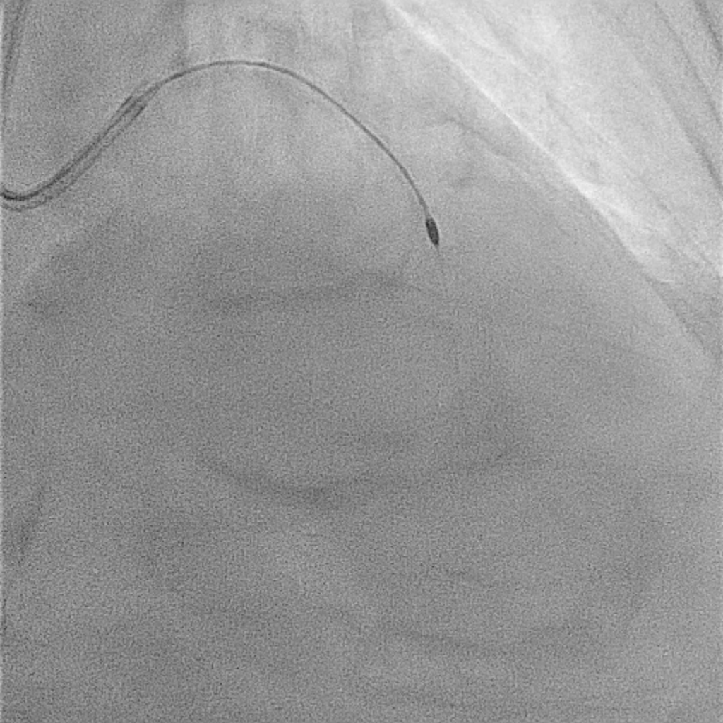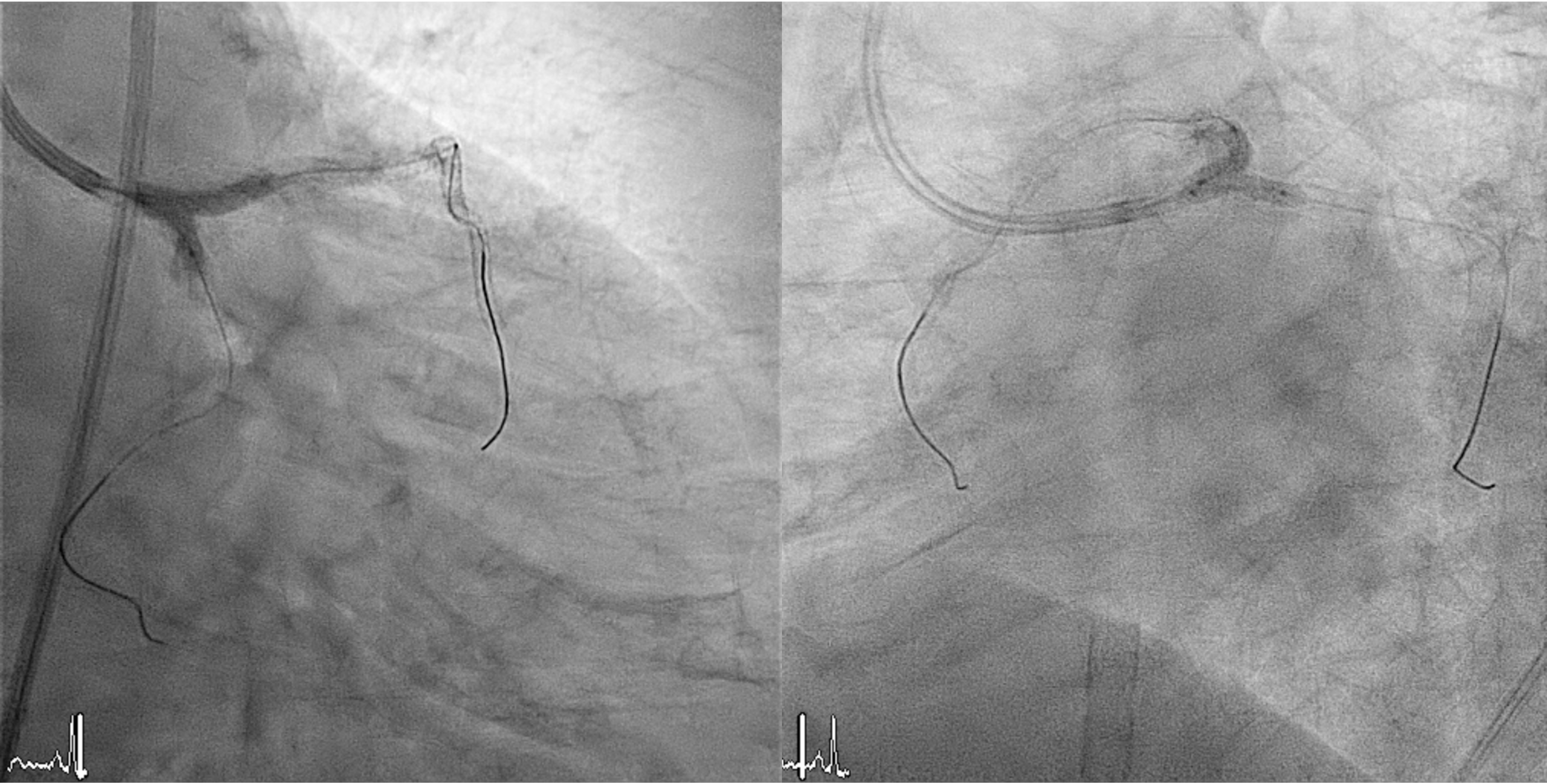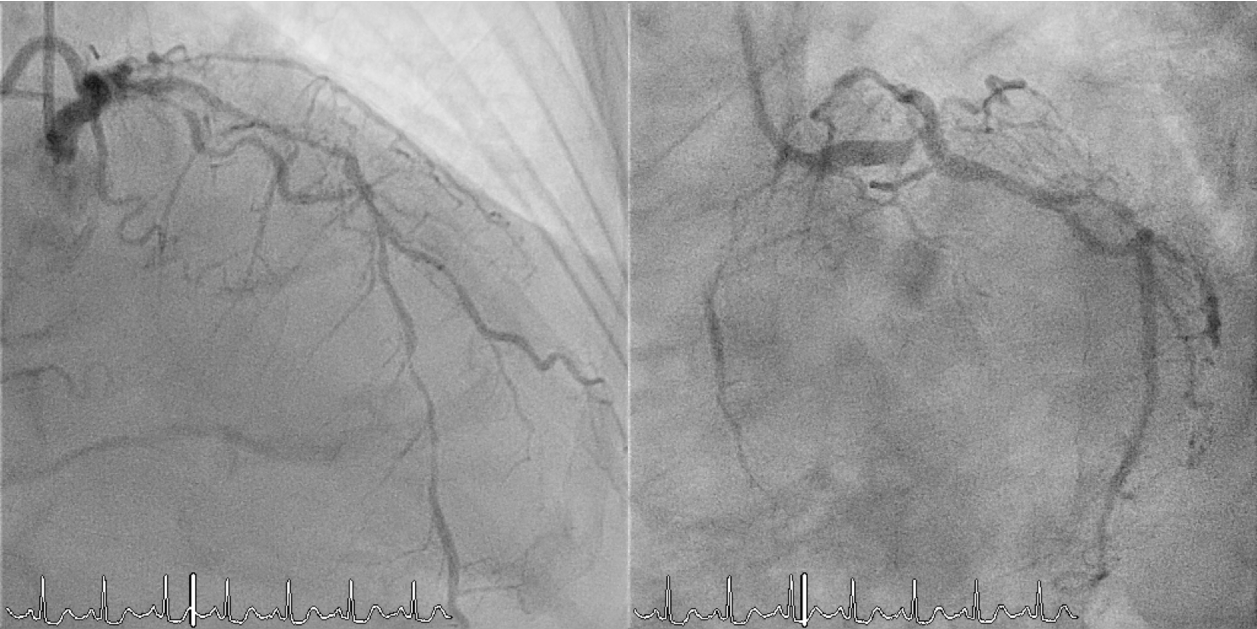 Coronary angiography revealed complex multivessel disease, with a syntax score of 42 points. The LMCA had a distal 95% eccentric lesion (Medina 1,0,0). The LAD showed diffuse disease with 70% stenosis proximally and 80% distally. The LCx had a proximal 90% and mid–distal diffuse 90% stenosis, with the OM showing a 70% proximal–mid lesion. The RCA had a proximal 85% and mid–distal 60% stenosis, and the small PDA had an 80% proximal lesion.