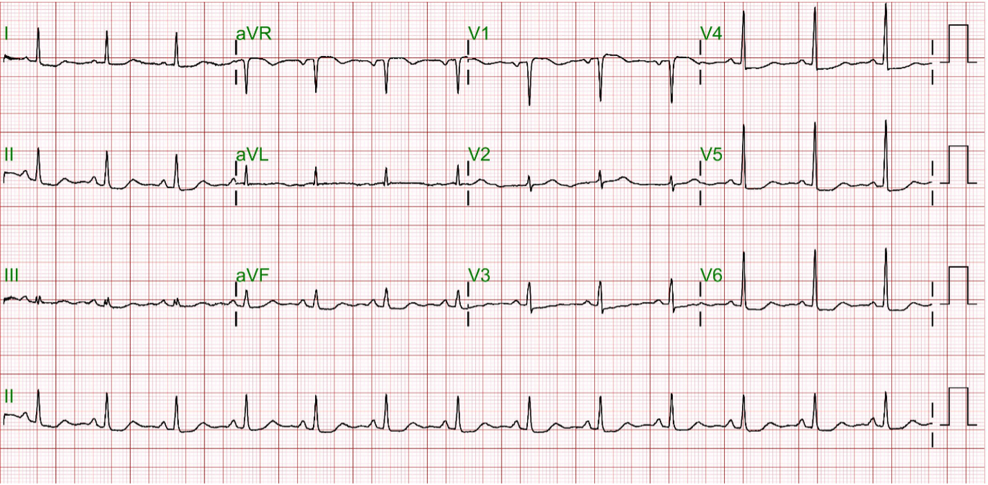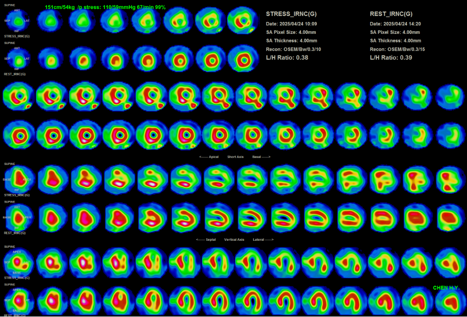 Laboratory studies revealed low-density lipoprotein cholesterol (LDL-C) 146 mg/dL, total cholesterol 230 mg/dL, and hemoglobin A1c 5.8%. Electrocardiography demonstrated normal sinus rhythm with diffuse ST-segment depression in leads II, III, aVF, and V4–V6. Transthoracic echocardiography showed a preserved ejection fraction of 60%. Thallium-201 myocardial perfusion imaging suggested significant coronary artery disease involving the left anterior descending and left circumflex arteries