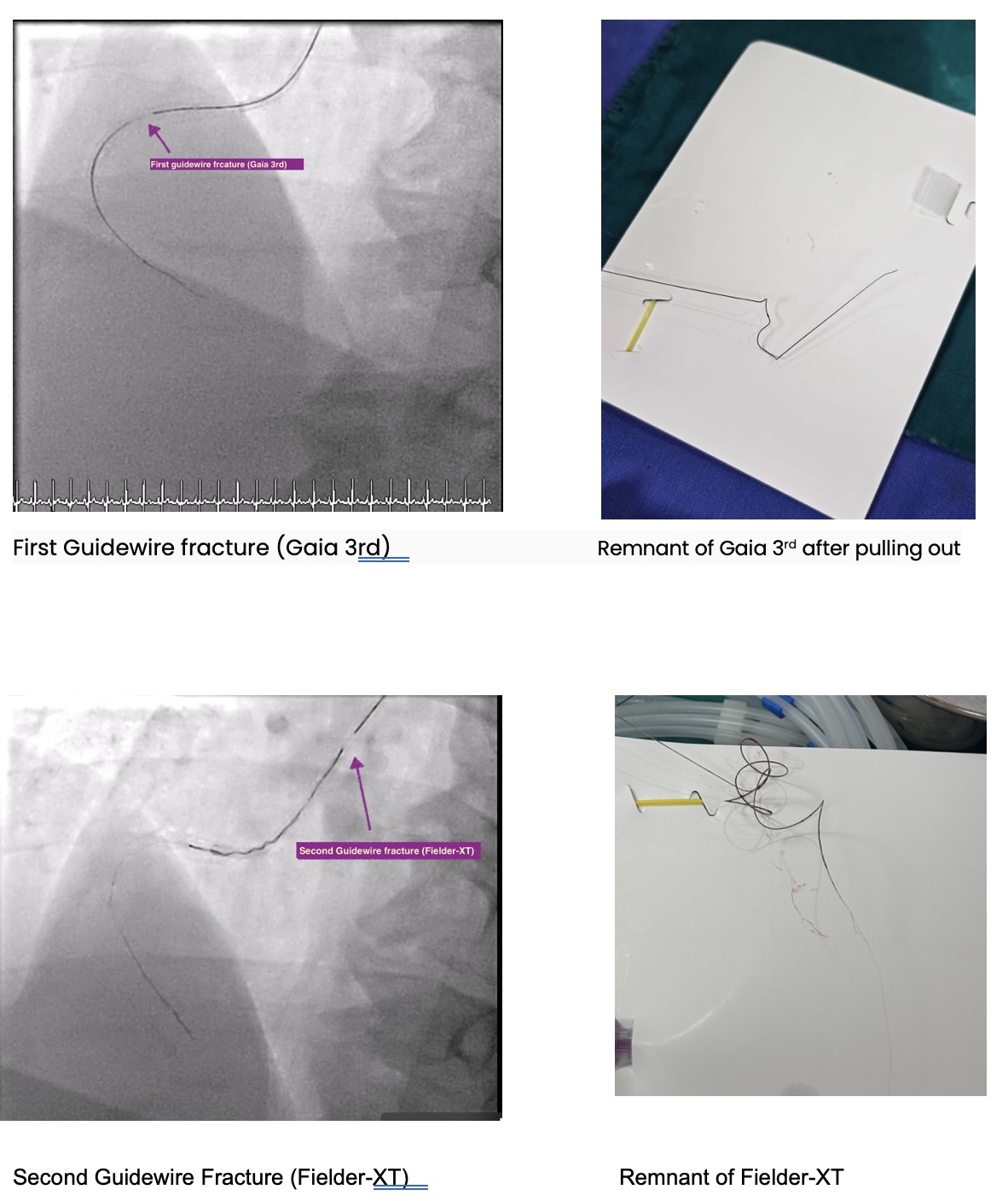 Microcatheter (Finecross) with Fielder XT to RCA, unable to pass the CTO lesion then changed to Gaia 2nd which was unsuccessful too and finally changed to Gaia 3rd. Gaia 3 rd guidewire got stuck at distal RCA. Snare catheter 8 mm was inserted to retrieve Gaia 3rd guidewire which was unsuccessful (Several attempts). Turntrac guidewire and Fielder-XT was inserted across the lesion to twist wire for Gaia 3rd retrieval, but failed and complete fracture of all three wires happened. Snare Size 8 mm was inserted for retrieval but failed.Smaller snare size 7 mm and 4 mm were inserted for retrieval but failed.Left femoral artery puncture with 8 Fr. Sheath. Guiding catheter JR 4.0/7 was used. Snare 8 mm and 15 mm via LFA could retrieve some part of wire. Decided to leave the wire at RCA due to several failed attempts. Angiogram was done before stopping the procedure. As we were removing the catheter, thin stretched guidewires were seen floating in the ascending aorta till descending aorta. Snare 15 mm could remove the wire floating in the aorta after several attempts.Final angiogram showed retained some parts of fractured guidewires and planned to leave it there. The patient was asymptomatic and hemodynamically stable.