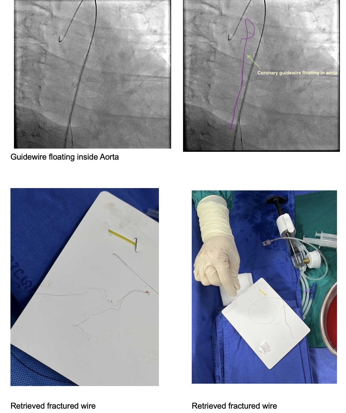 1. Factors that predispose to guidewire fracture include severe vessel calcification, sharp side branch angulation, excessive wire manipulation, and variations in wire length or thickness 2. Guidewire is thrombogenic and its presence inside the coronary or hanging up into the aorta may carry a risk of thrombo-embolization, making its removal essential. 3. Strategies for retrieval of fractured guidewire includes snaring, multiwire technique, trapping techniques, stenting, surgical removal or leaving the corpus alienum in-situ. 4. GooseNeck snare is a feasible approach for retrieving a lost guidewire confined to proximal coronary artery.