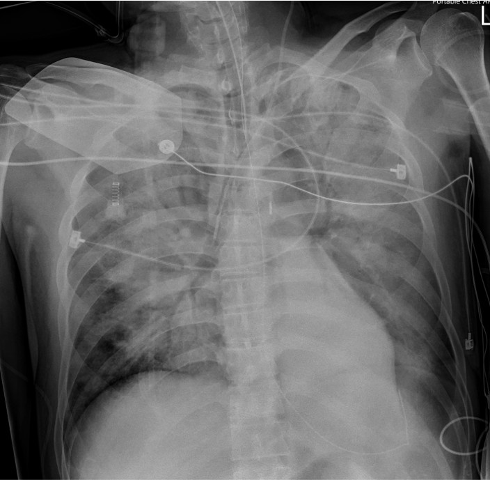 Supportive Management (Mar–Jun): Multiple ventilator-associated pneumonias (S. maltophilia, E. cloacae) and ARDS were managed with prone positioning (Mar 18–21, Apr 23–25, May 1–3). Tracheostomy was performed on April 7, and VATS decortication for left upper lobe hematoma on April 30. Recurrent AF with RVR required cardioversion (Mar 7, Jun 10). By June, the patient was successfully weaned, with LVEF 39% and moderate MR. He was discharged on June 13 in stable condition for medical air transport.