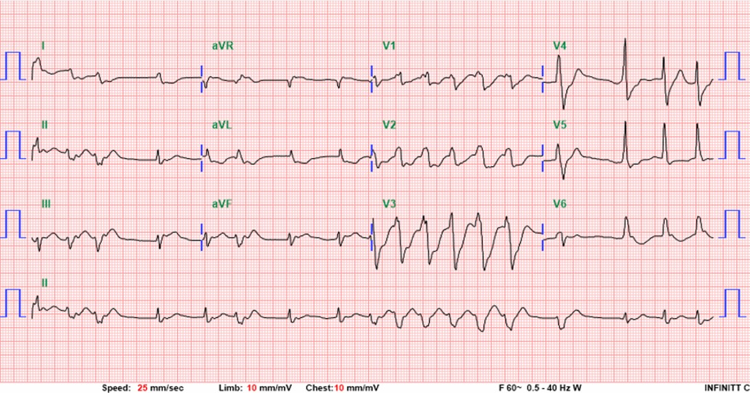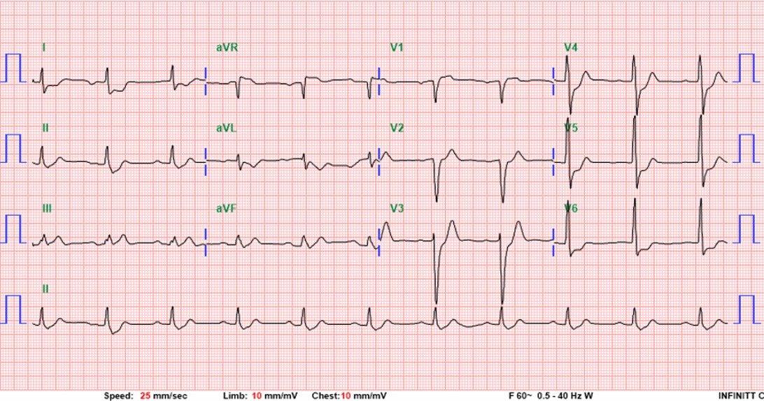 A 50-year-old man with hypertension and ulcerative colitis on vedolizumab developed dyspnea and chest tightness while visiting Taiwan. On February 28, he collapsed after bathing with pulseless electrical activity arrest. Cardiopulmonary resuscitation for 48 minutes achieved return of spontaneous circulation. Electrocardiogram showed ST elevation in aVR with diffuse ST depression. Lactate was 11.5 mmol/L. ECMO and IABP were initiated for cardiogenic shock.