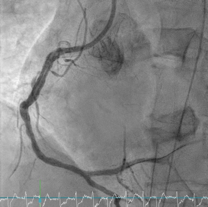 Staged LM–LAD PCI (Apr 18): Two DES were deployed in the LM–LAD under mechanical and pharmacologic support.