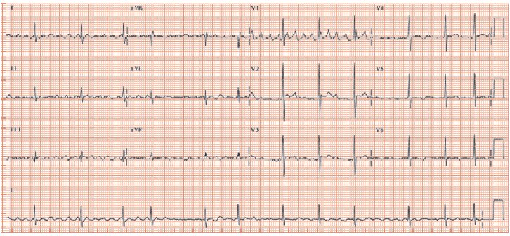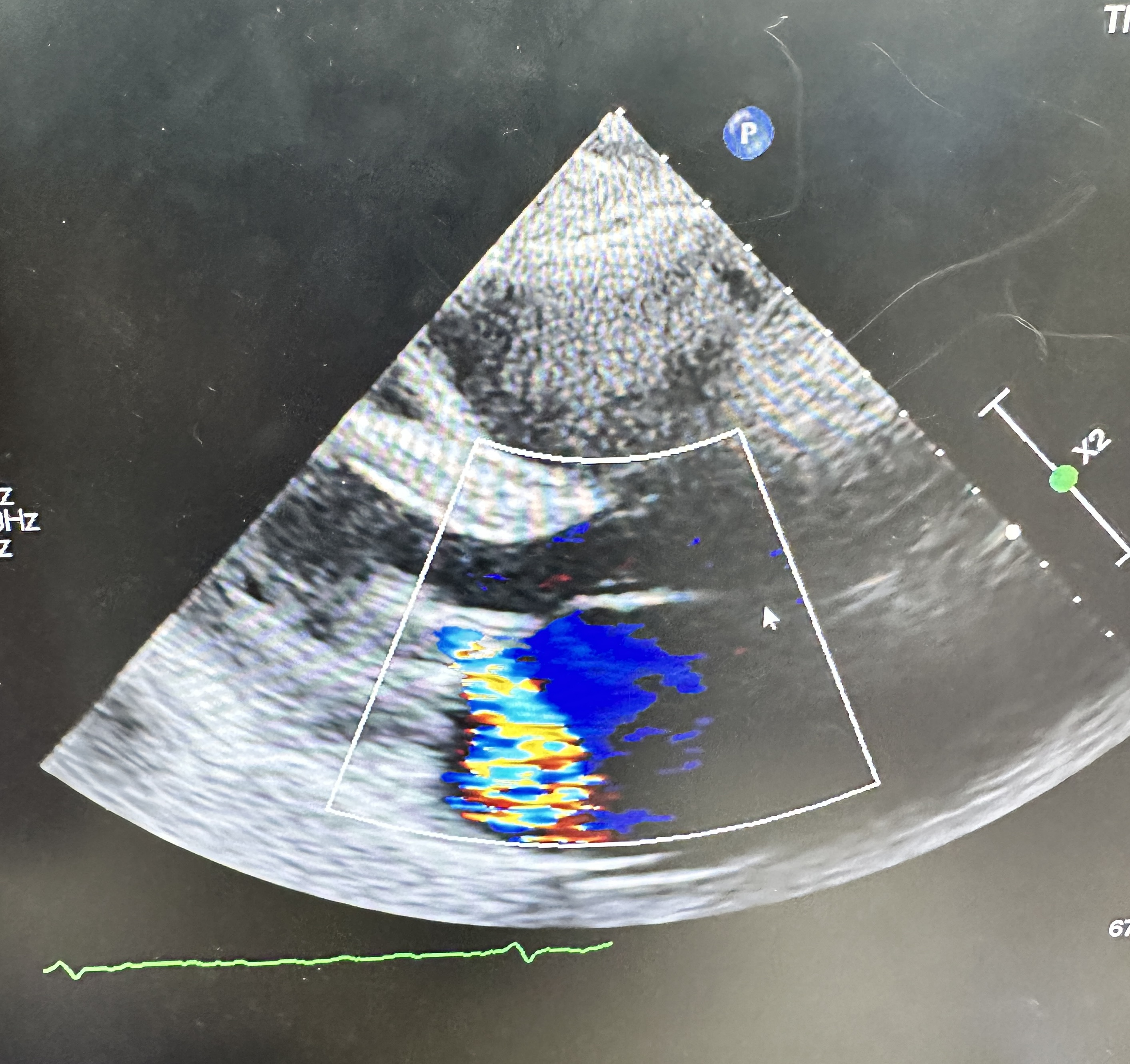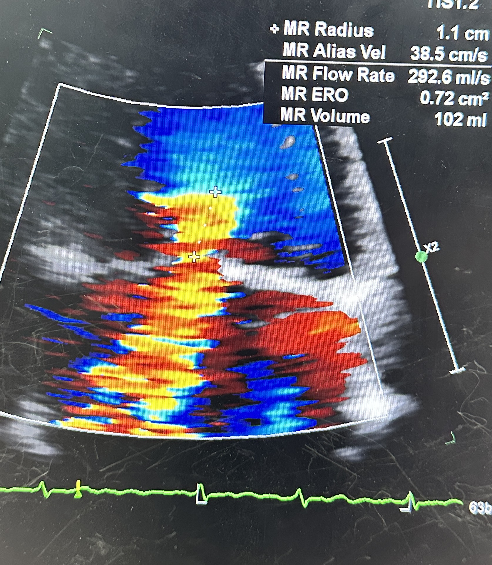 ECG: AF without acute ischemic change.CXR:CardiomegalyEchocardiogram: Severe primary (degenerative) mitral regurgitation due to mitral valve prolapses with flail P2 segment (Carpentier Type II), by integrative criteria (EROA ¡Ã0.4 cm©÷,regurgitant volume ¡Ã60 mL, vena contracta ¡Ã0.7 cm, systolic PV flow reversal,dense triangular CW jet). Baseline ECG: sinus rhythm without acuteischemic change.