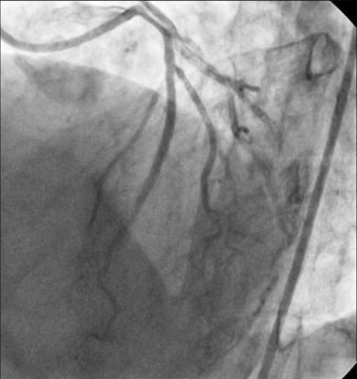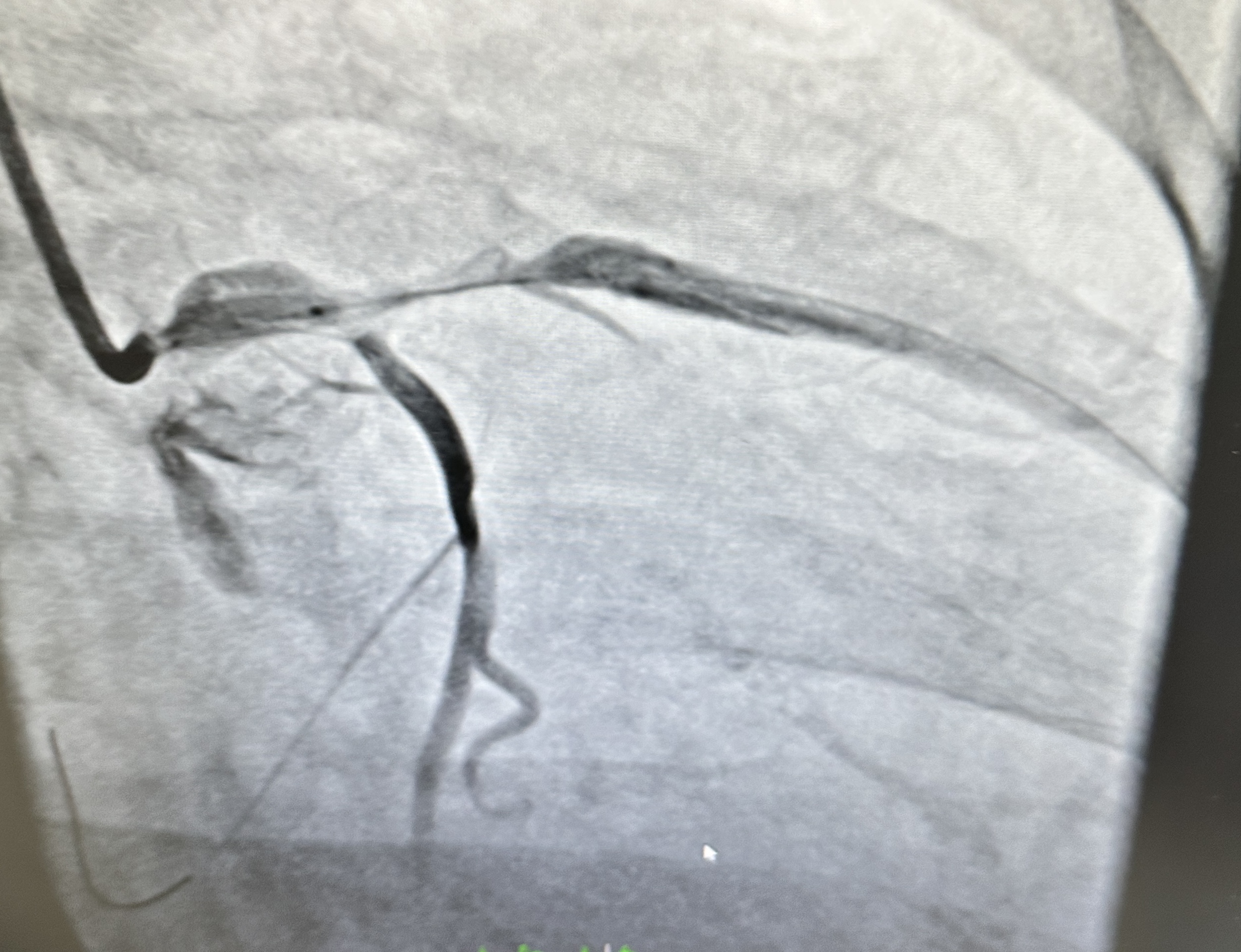 Right Coronary Artery (RCA): Dominance right. Large caliber, no significant stenosis. Angiographically normal with TIMI 3 flow. Left Main (LM): On first contrast injection afterJL engagement, mild ostial contrast staining was observed. On the second injection, there was more pronounced staining with dye hang-up, consistentwith catheter-induced LM dissection with suspectedpropagation toward the LAD/LCX.
