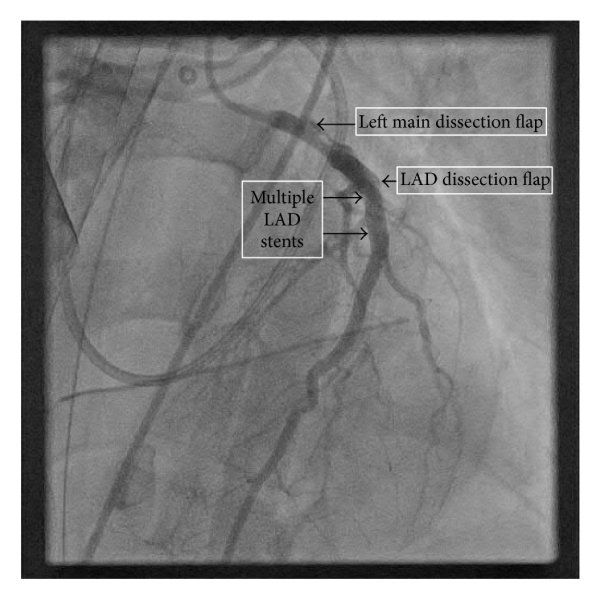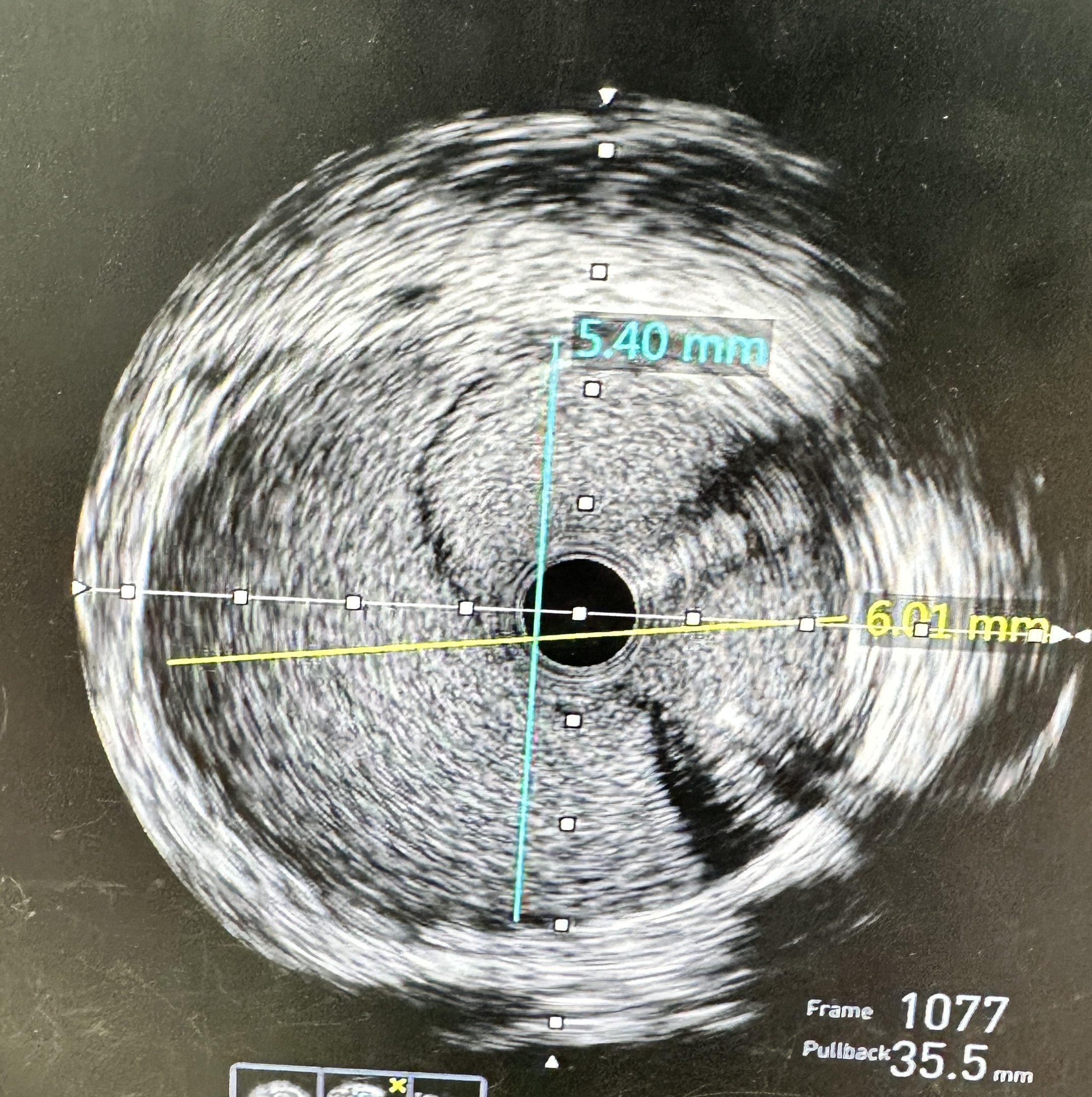 - Imaging: IVUS pre-PCI confirmed dissection/intimal flap with intramural hematoma extending into proximal LAD/LCX; post-PCI showed good expansion/apposition, no residual entry.