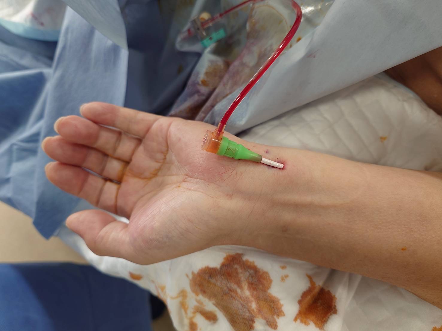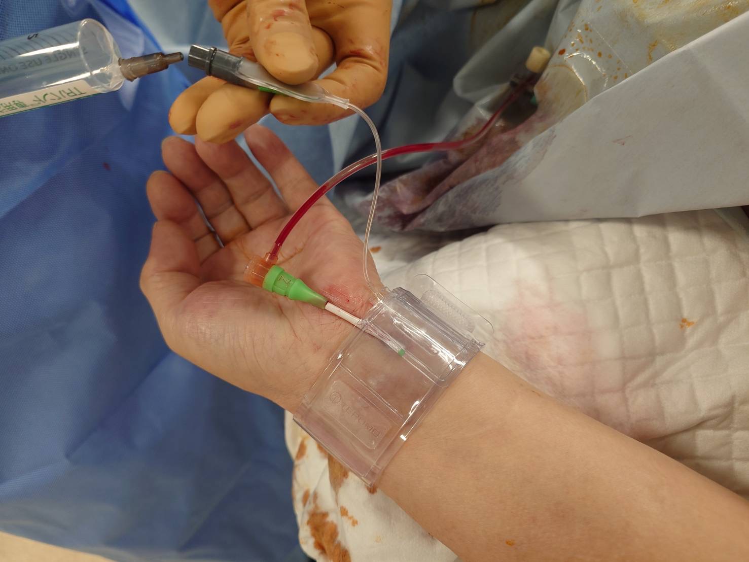 Pre-procedural vascular ultrasound revealeda high brachial bifurcation approximately 10 cm proximal to the antecubitalfossa and a small-caliber left radial artery. No significant calcification orstenosis was detected. Based on these findings, the left ulnar artery wasselected as the access route.