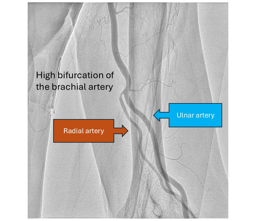 Pre-proceduralultrasound evaluation of the upper limb arteries enables detection ofanatomical variations such as high brachial bifurcation and facilitates safeand effective selection of the access site. The ulnar artery can serve as areliable alternative when the radial artery is unsuitable, reducing the needfor brachial or femoral access and associated complications.