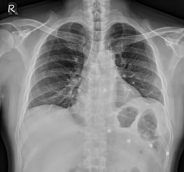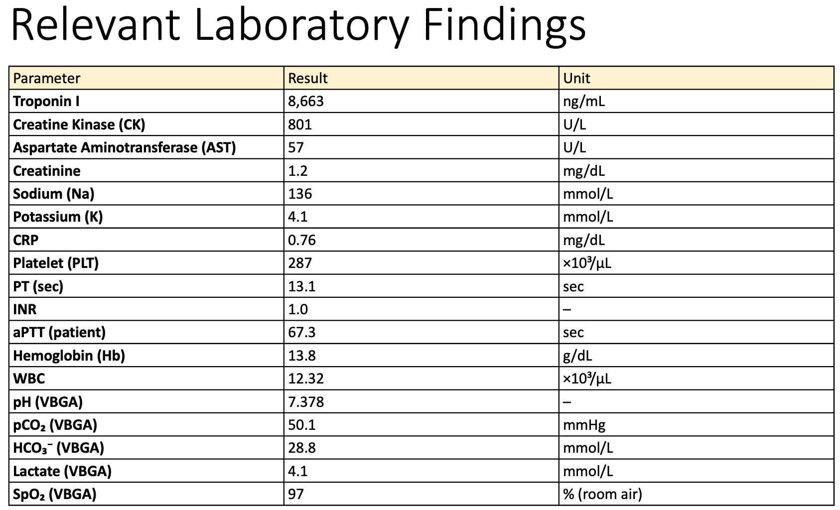 Laboratory testing showed markedly elevated cardiac troponin I (8,663 ng/mL), consistent with acute myocardial injury. The overall findings suggested an acute coronary syndrome, specifically non-ST-elevation myocardial infarction (NSTEMI), prompting further diagnostic evaluation with coronary angiography.