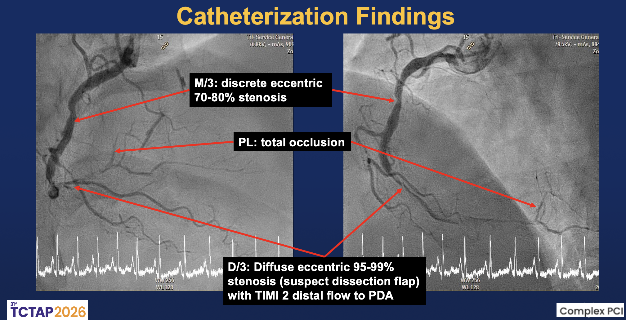The left main was patent. The LAD showed diffuse eccentric 70–90% stenosis from proximal to distal segments with preserved TIMI 3 flow. The LCx had distal 80–90% and OM2 ostial-proximal 70–80% stenoses with small caliber, giving collaterals to PL. The RCA was dominant with mid 70–80% stenosis and distal diffuse 95–99% stenosis, suggesting a dissection flap with TIMI II distal flow; the PL branch was totally occluded.