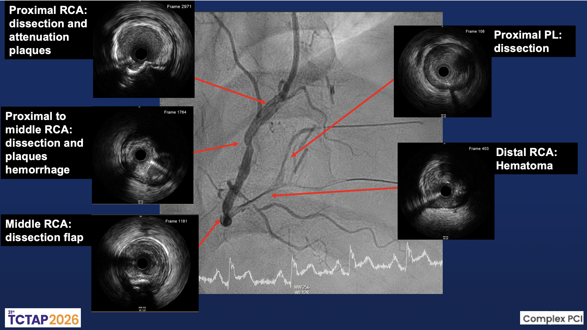 This case highlights the complexity of PCI in spontaneous coronary dissection. Technical challenges include wiring the true lumen, managing propagation of intramural hematoma, and maintaining side branch patency. IVUS imaging was crucial in identifying multiple dissection planes, hematoma extension, and plaque hemorrhage, guiding appropriate stent sizing and landing zones. Careful wire selection and controlled manipulation are essential to avoid false-lumen entry and further vessel injury. While drug-coated balloon therapy has been reported in selected cases, evidence remains limited.
