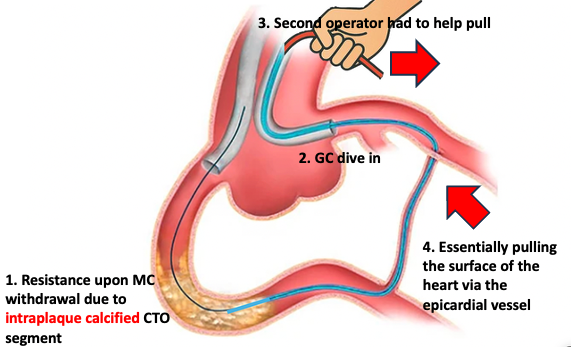 Retrograde PCI to CTO carries risks specific to retrograde approach. LV "billowing" can occur on withdrawal of retrograde MC, especially in this case, due to intra-plaque calcified CTO path and pulling force to antegrade GC by second operator, resulting in a lifting force via the epicardial collaterals. This highlights the importance of understanding risk factor specific to each case and communication between operators. Moreover, trapped IVUS is unusual but important to know how to tackle in a 6F system.