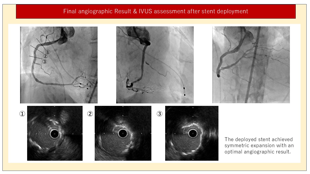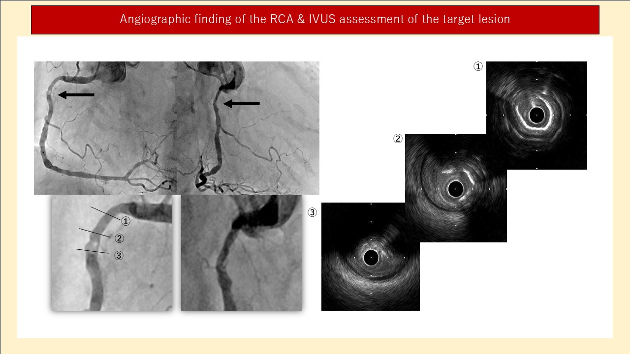coronary angiography was performed, which revealed 75% stenosis in segment #1, 90% stenosis in segment #2, maintained patency of the previously implanted stent in segment #7, and 90% stenosis in both segments #13 and #15. Revascularisation of the right coronary artery (RCA), particularly at segment #2, was planned as the culprit lesion.