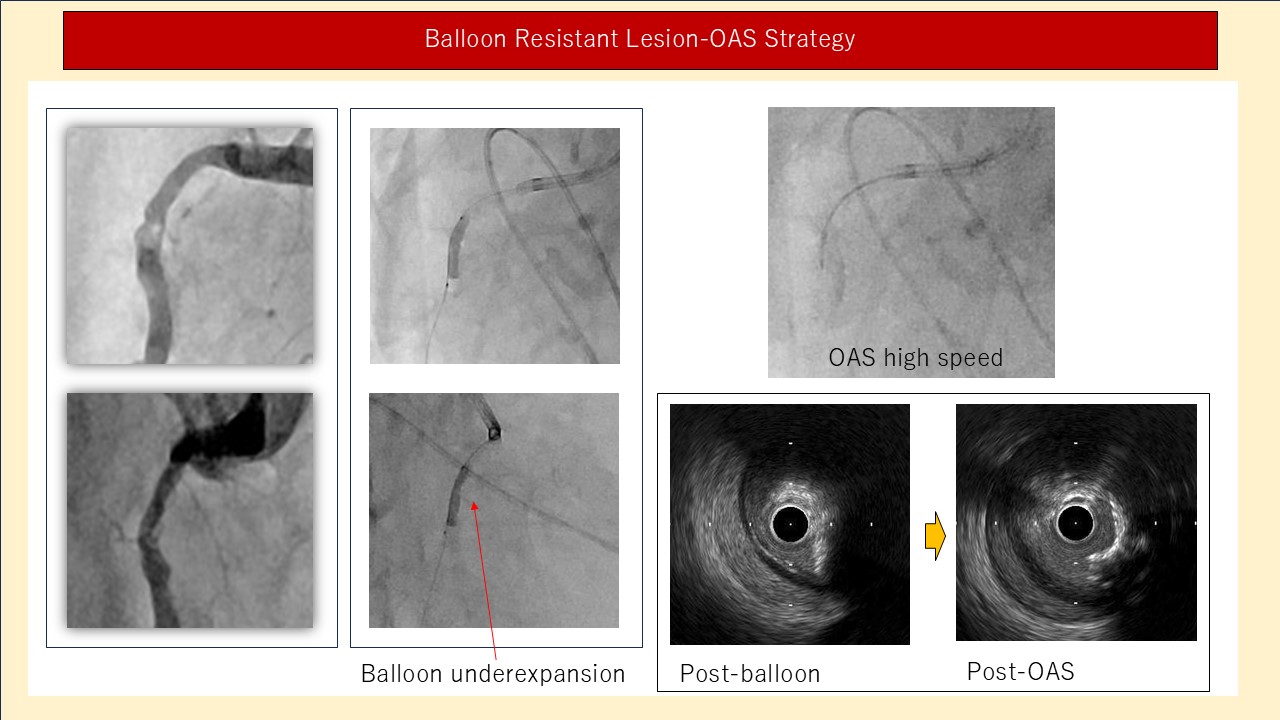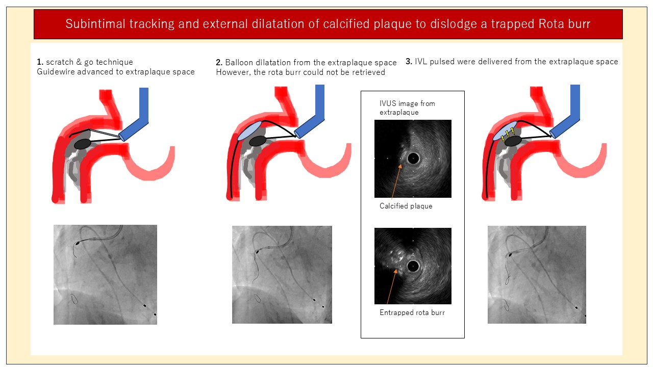 PCI was performed via a 7 Fr femoral approach using an AL 1.5 guiding catheter. A Sion guidewire crossed the lesion, and IVUS confirmed concentric calcification. RA was initiated with a 2.0 mm burr under Dynaglide mode. During advancement across segment #1, the burr became immobile within dense calcification. Repeated traction failed to free it. Parallel wiring using multiple wires was unsuccessful. A high-tip-load polymer-jacketed guidewire, designed for peripheral intervention, was advanced distally and entered the false lumen. Contrast injection via a guide extension confirmed its subintimal course adjacent to the burr. Balloon dilatation (2.0 mm at 6 atm) from the false lumen failed to release the burr. IVUS imaging revealed the burr tightly compressed between circumferential calcium. IVL was performed from the false lumen using a 2.5 ¡¿ 12 mm Shockwave balloon, delivering 80 pulses. After lithotripsy, gentle traction allowed the burr to be retrieved safely without perforation. IVUS confirmed re-entry into the true lumen. Further plaque modification was achieved using orbital atherectomy (Diamondback 360¢ç, Cardiovascular Systems, MN, USA) and a 3.0 ¡¿ 10 mm Wolverine cutting balloon, followed by implantation of a 3.5 ¡¿ 48 mm Synergy XD drug-eluting stent (Boston Scientific). Final angiography showed optimal expansion and TIMI 3 flow. The patient remained stable and was discharged without complications.