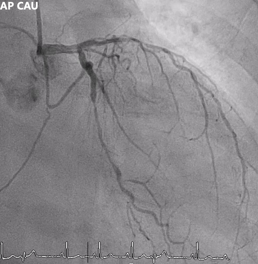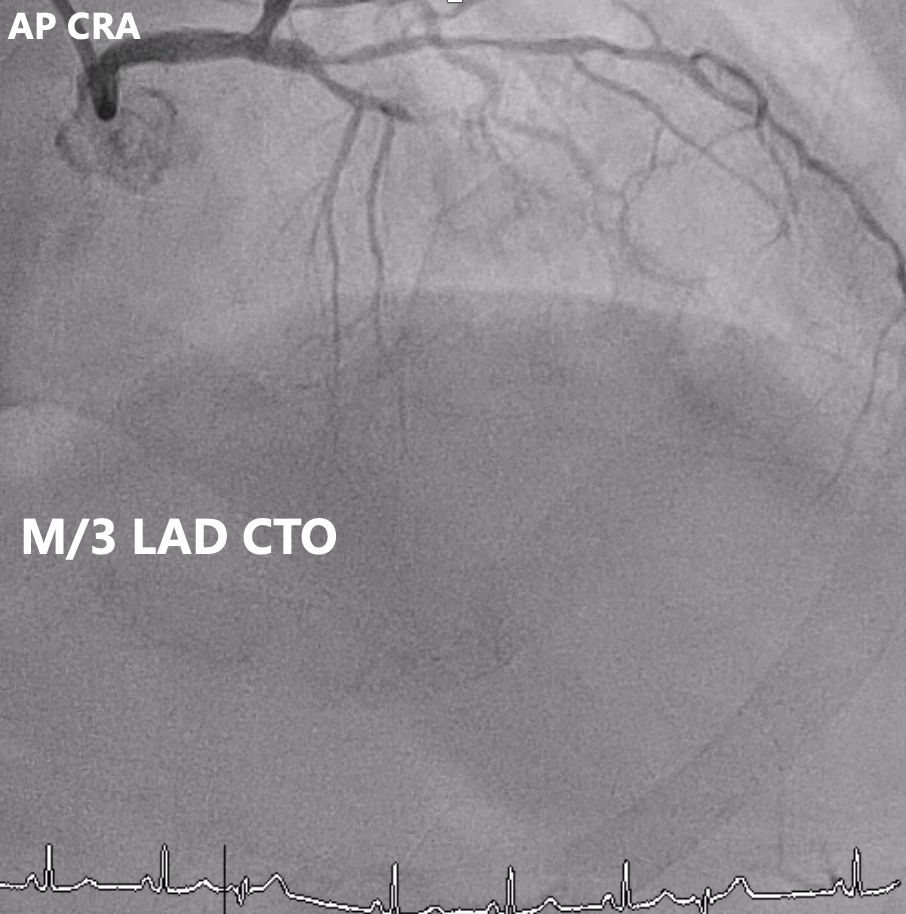 Angiography showed multivessel atherosclerosis with the LAD being the most critical lesion. The mid LAD had tubular eccentric 70–80% stenosis with a Medina (0,1,1) bifurcation and a mid-segment CTO (~2 cm, blunt end). DB1 had 70–80% ostial stenosis with 50–70% diffuse disease, and DB2 had a short CTO with distal collateral flow from DB1. Other vessels had non-critical or moderate diffuse disease.