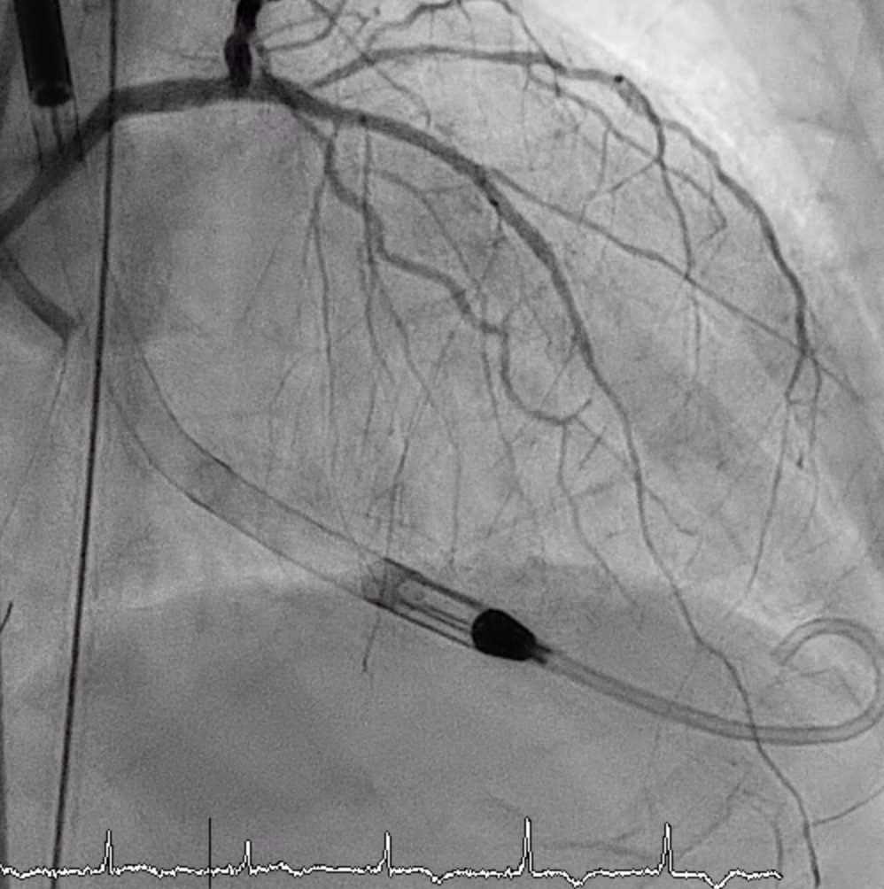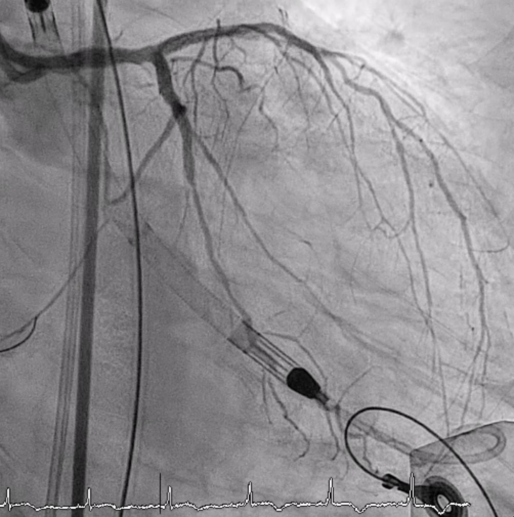 Left CFA was accessed under fluoroscopy/ultrasound, a 14 Fr sheath inserted, and a pigtail advanced into the LV before exchanging to the Impella system. The device was positioned across the aortic valve to 76 cm with correct waveforms. Adequate support was achieved. Atrial flutter occurred and was cardioverted with 100 J.LAD Intervention: