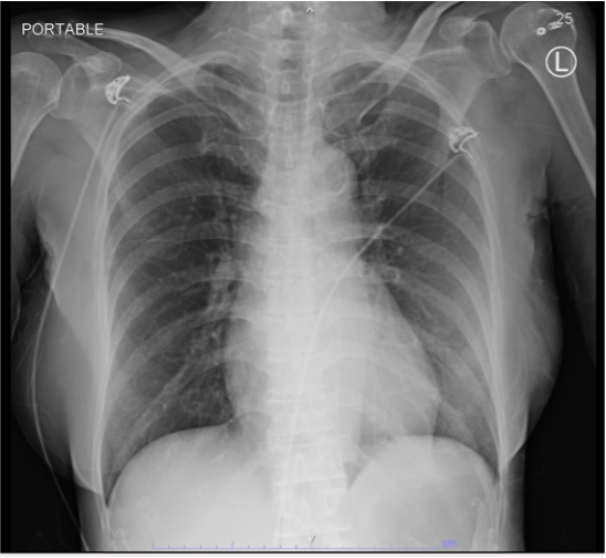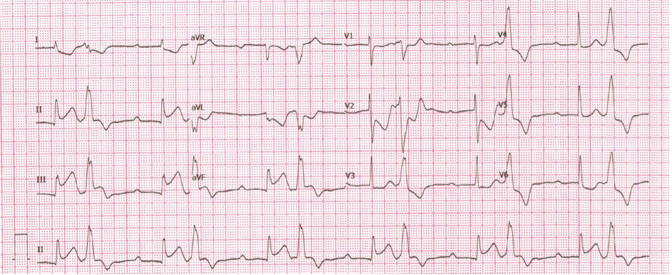 Electrocardiogram (ECG) was performed-showing sinus rhythm 60 bpm with ST-segment elevation in leads II, III, aVF, ST-segment depression in leads I, aVL. ECG show AV dissociation develop to 3rd degree AV block and present bigeminy ST segment elevation PVCs . CXR no pulmonary congestion . High sensitivity troponin-I was requested with highly elevated result as 1,957 ng/L. Echocardiogram showed LVEF 50%, Inferior, inferoseptal and inferolateral wall hypokinesia