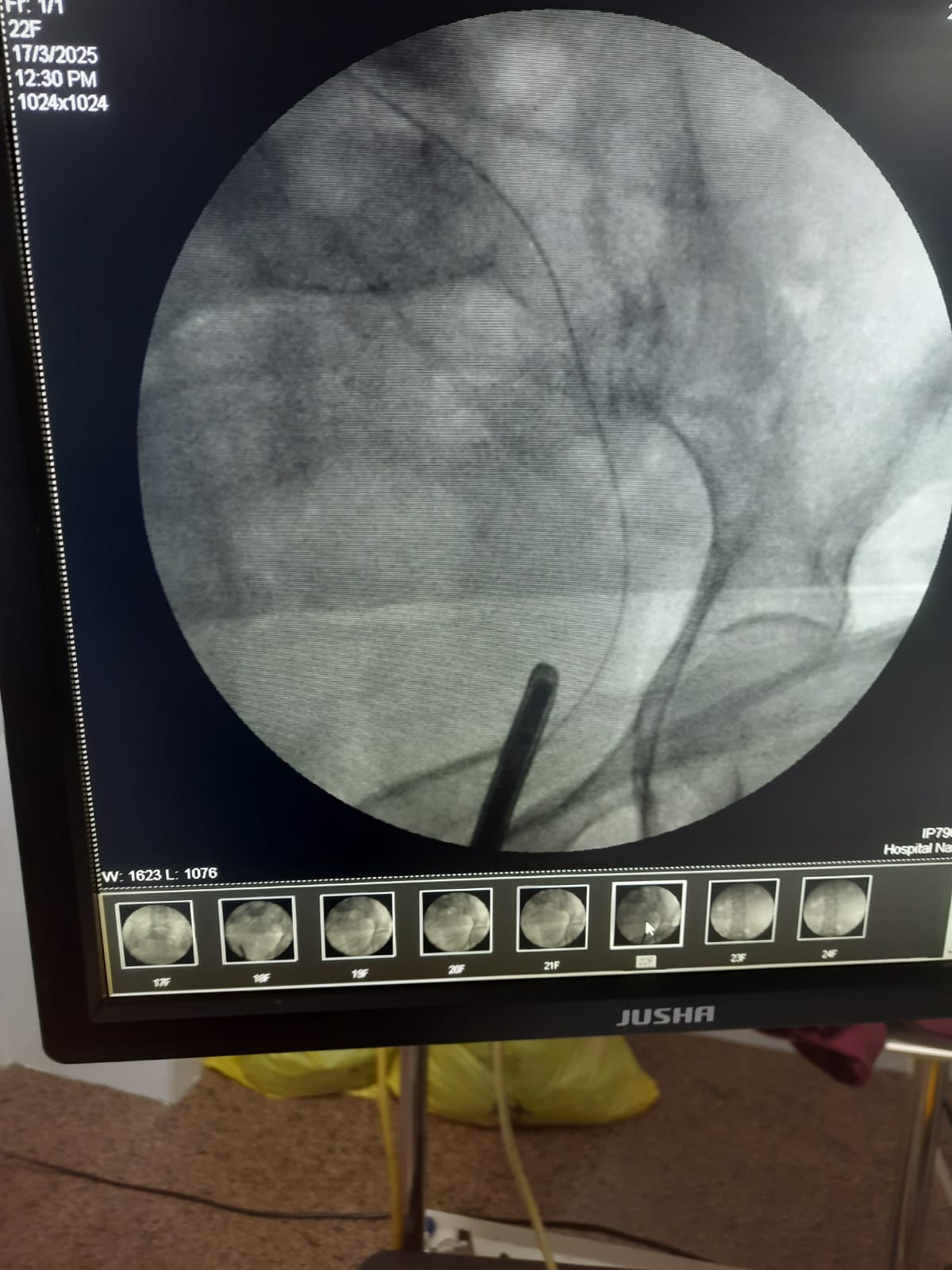 Initial attempts at retrograde left ureteric stenting were hampered by a completely adherent stone, preventing the passage of a standard guide wire. A subsequent thinner, hydrophilic Terumo guide wire was easily negotiated past the obstruction. A diagnostic anomaly was noted when the passage showed an unusual rightward curvature upon successful navigation, leading to suspicion of misplacement.