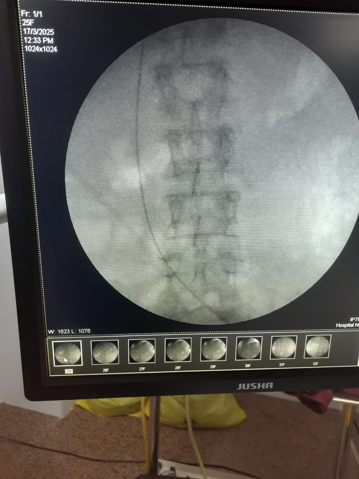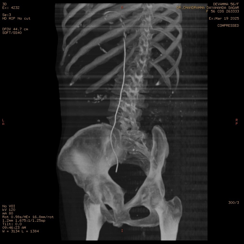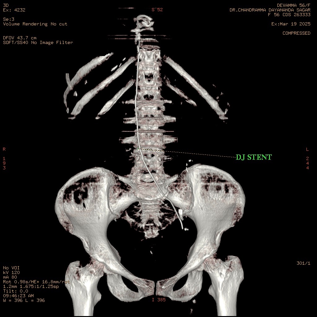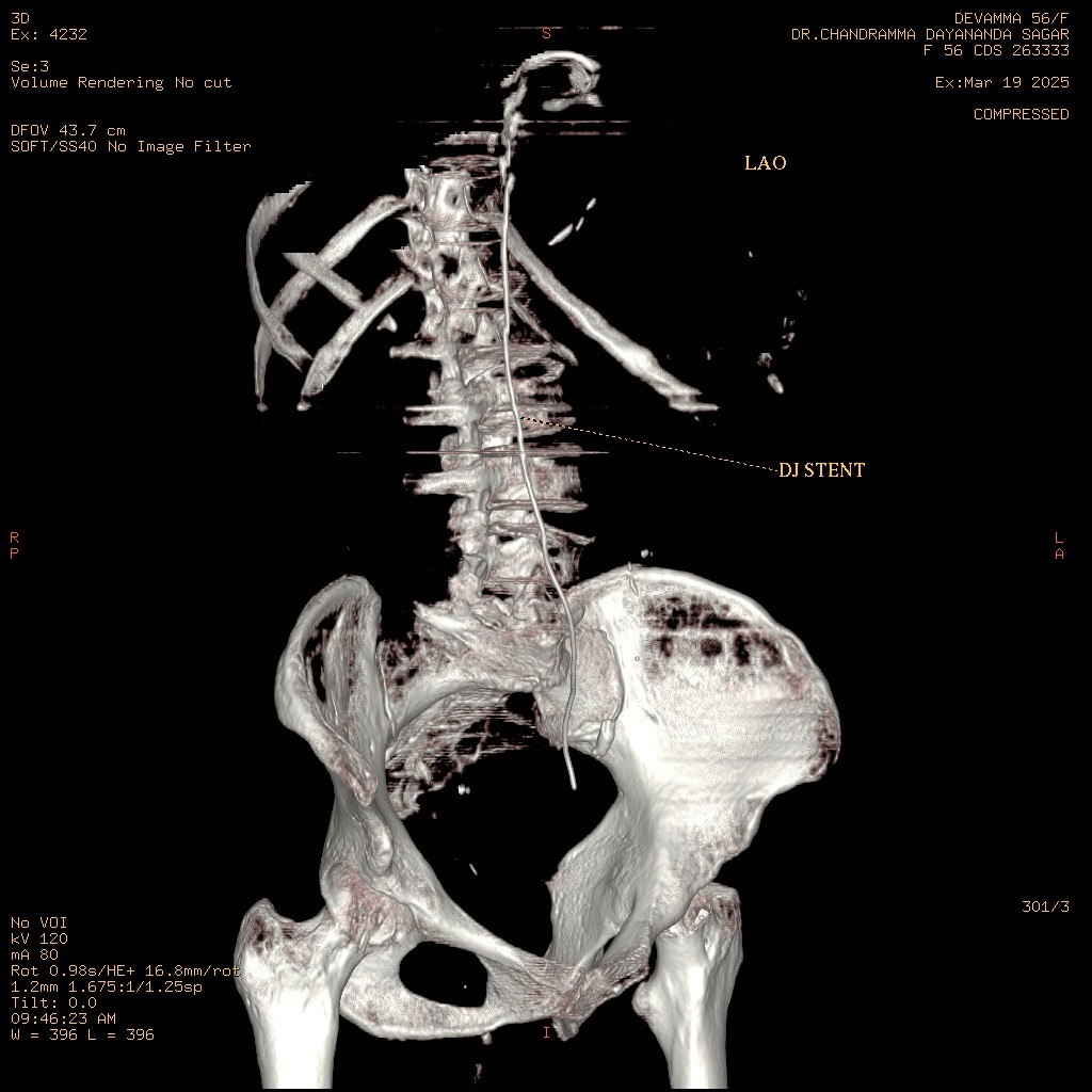 A middle-aged female patient presented with acute onset, severe, colicky left flank pain radiating to the groin for four days. There was no associated history of fever, gross hematuria.Pre-operative CT Kidney Ureter Bladder with contrast revealed right ureteric and left renal calculi.On admission, vital signs were stable: Physical examination was unremarkable, with a soft, non-tender abdomen and normal bowel sounds. The patient remained hemodynamically stable throughout the initial evaluation.