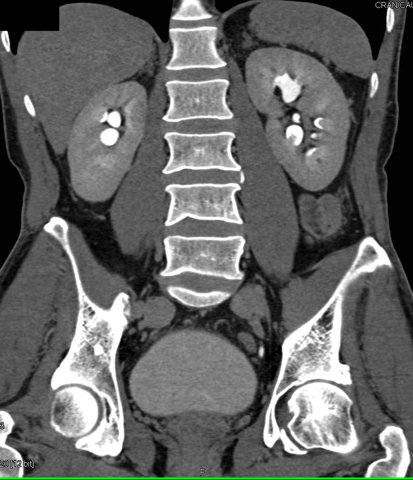 Initial laboratory work-up showed normal renal function (details of specific values withheld for privacy/length). Imaging confirmed the diagnosis of right ureteric calculus and left renal calculus, which was the target of the initial intervention. The left kidney appeared hydronephrotic due to the obstruction.