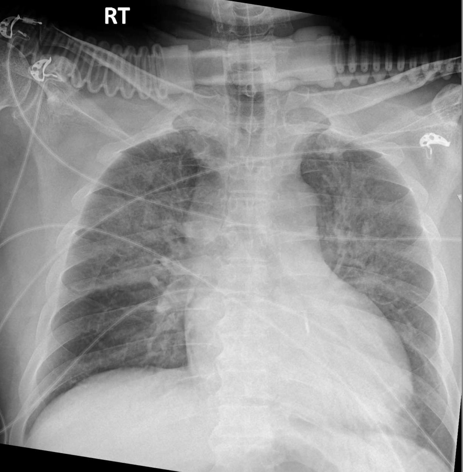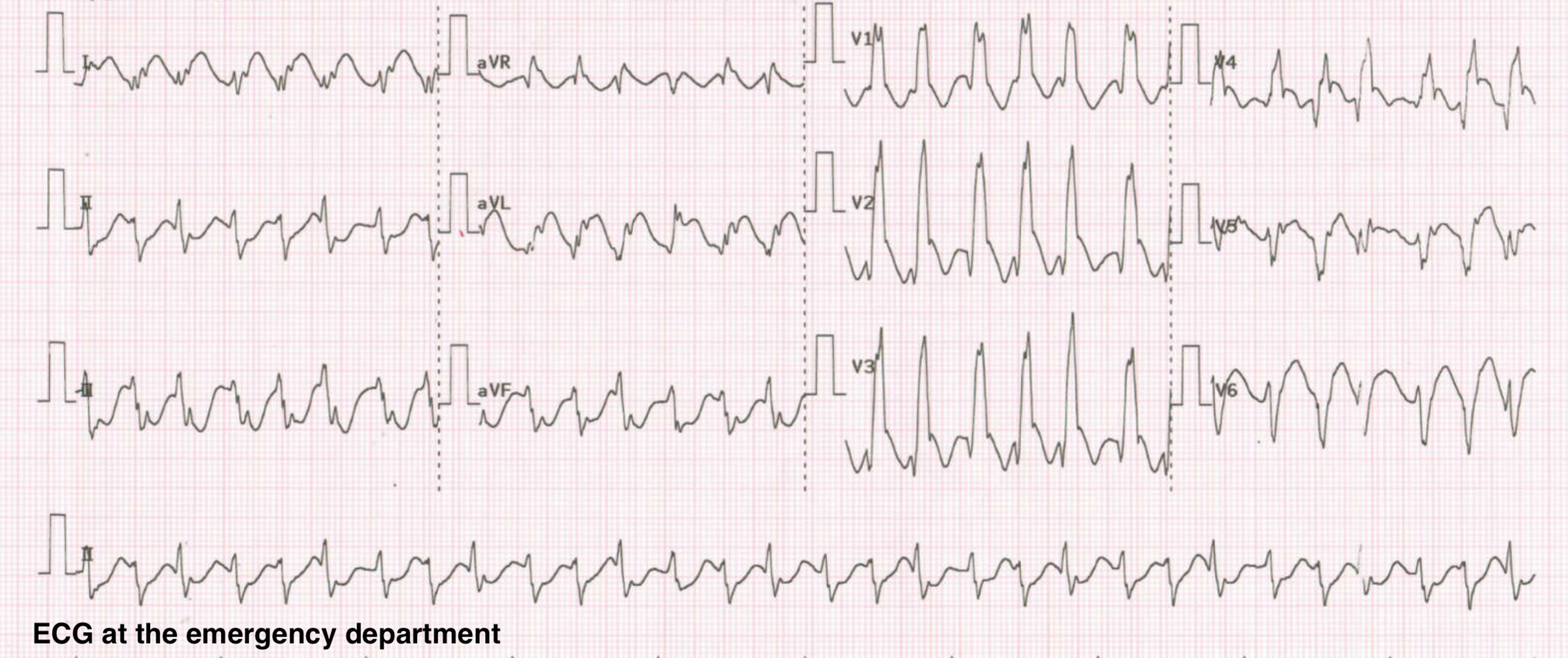 A 65-year-old Thai male with hypertension presented to the emergency department with acute chest pain and dyspnea. The ECG revealed anterolateral ST-segment elevation, new right bundle branch block, and atrial fibrillation. The emergency physician activated the primary PCI protocol. Prior to transfer to the cath lab, the patient was intubated using rapid sequence induction, and intravenous furosemide was administered. Aspirin and ticagrelor were loaded for dual antiplatelet therapy.