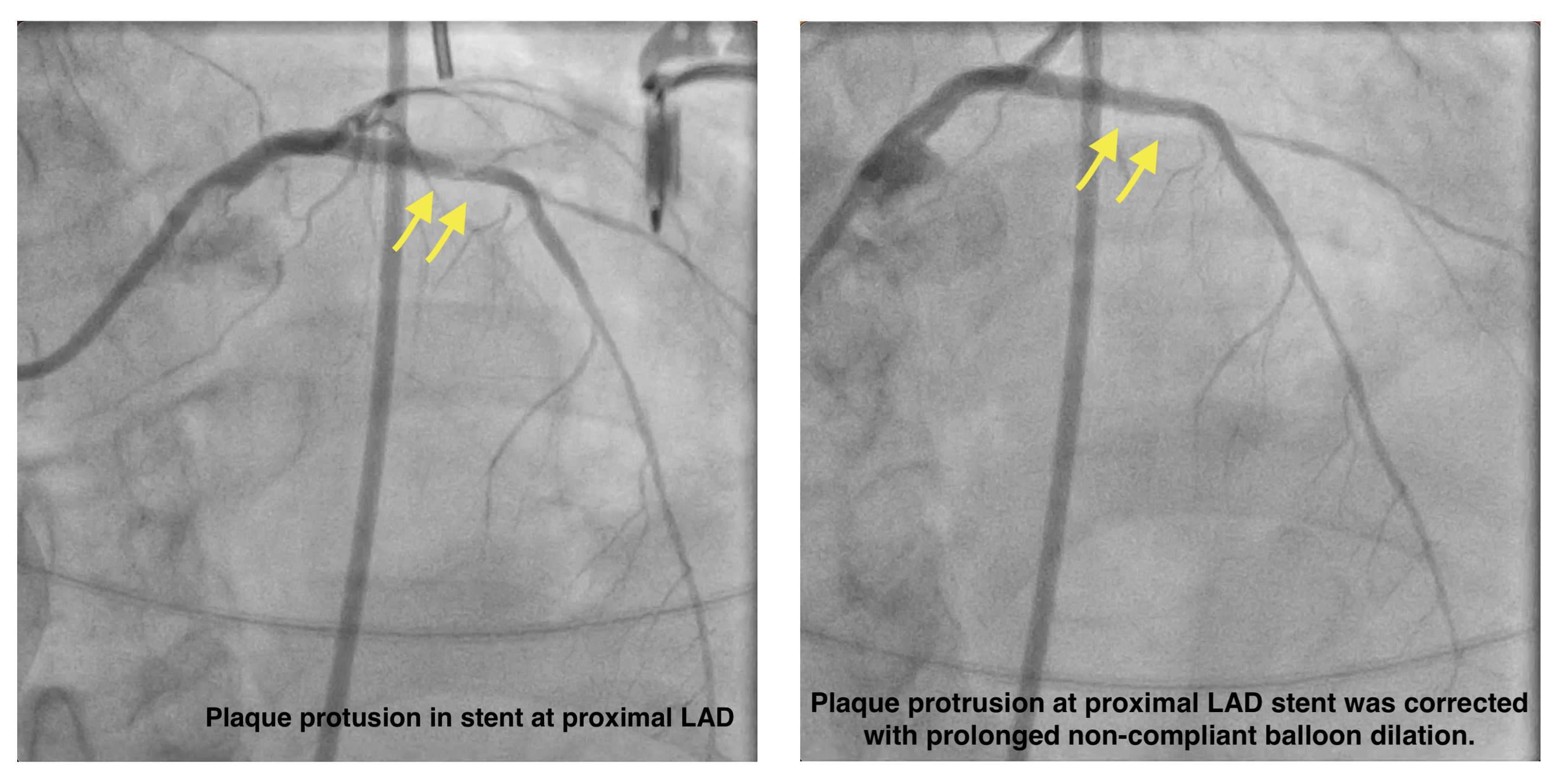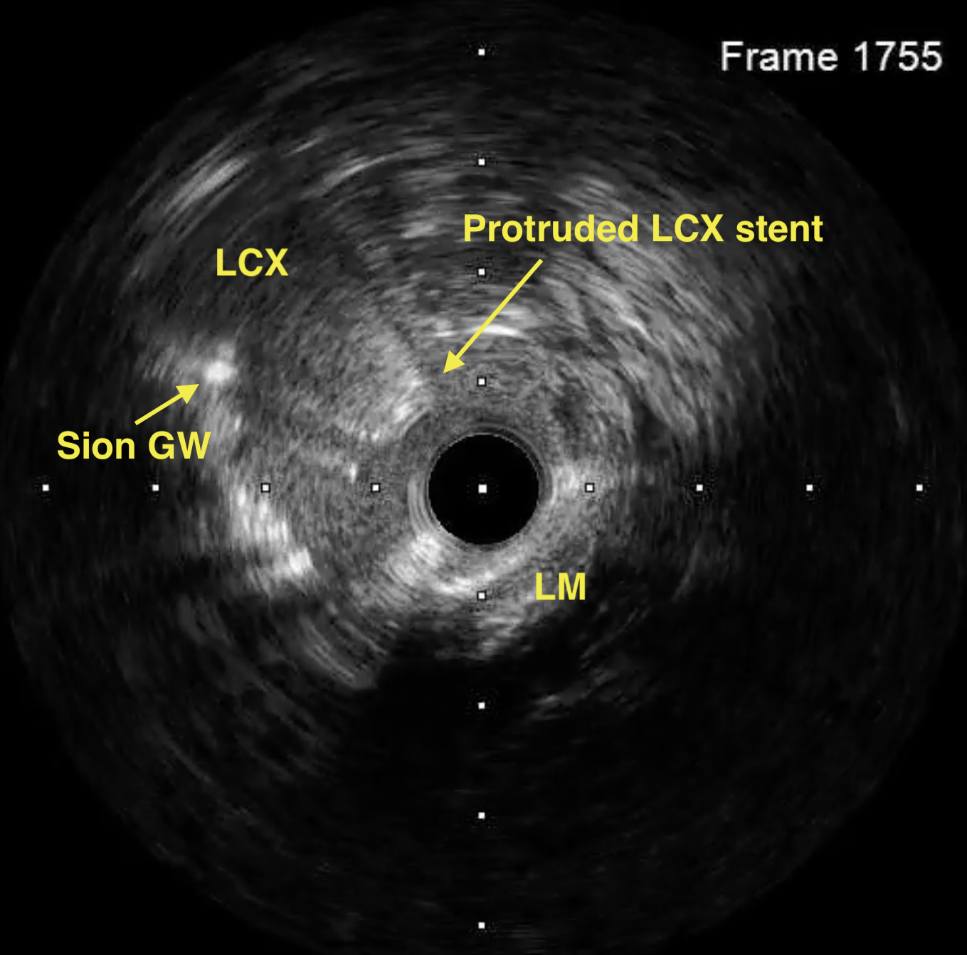 Access site: RRA 6F sheath, EBU 3.5 6F guiding catheter. IABP was inserted via RFA for hemodynamic support. A BMW guidewire (GW) was advanced into the LAD, & thrombus was aspirated. A Sion GW was then placed in LCX. IVUS guided a provisional strategy from LM to LAD restoring flow quickly. The lesion was pre-dilated with a 2.0 ¡¿ 20 mm balloon & a 2.5 ¡¿ 10 mm scoring balloon. Biomatrix Alpha stents (3.5 ¡¿ 36 mm & 2.5 ¡¿ 24 mm) were deployed from the LM to mid LAD & post-dilated. The LCX became jailed, so the T-and-Protrusion technique was initiated as a bailout, & a Biomatrix Alpha 2.5 ¡¿ 19 mm stent was positioned for TAP. After TAP, acute thrombosis developed at the neocarina of the LM. The patient received adequate heparin, intracoronary eptifibatide, & vasopressors. The procedure was stopped after achieving TIMI 3 flow in LAD & resolution of ST elevation. The patient was transferred to the ICU for intensive antithrombotic therapy. 3 days later, a relook angiogram via the LFA (EBU 3.5 7F) showed total LCX occlusion. IVUS confirmed excessive LCX stent protrusion into LM. Reverse Double Kissing Crush was performed. The protruded LCX stent was crushed with a 4.0 ¡¿ 12 mm non-compliant balloon, Sion Blue GW was advanced through the proximal strut, & final kissing inflation with proximal optimization was completed. Plaque protrusion at proximal LAD stent was corrected with prolonged NC balloon dilation. Final IVUS & angiography showed good result.