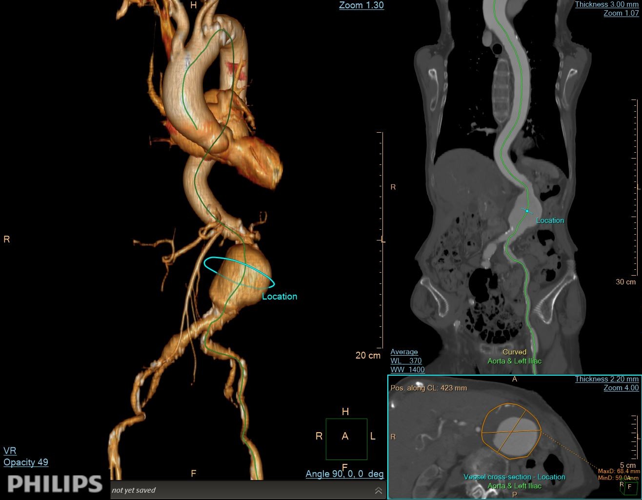An 86-years-old woman presented with abdominal discomfort and a mass-like sensation. Abdominal ultrasound revealed an abdominal aortic aneurysm (AAA), which was confirmed by CTA. She was hemodynamically stable with no signs of rupture. Physical examination showed peripheral pulses palpable bilaterally, and the case was planned for elective endovascular aneurysm repair (EVAR) under general anesthesia.