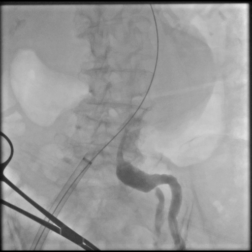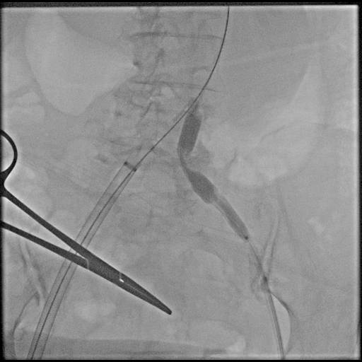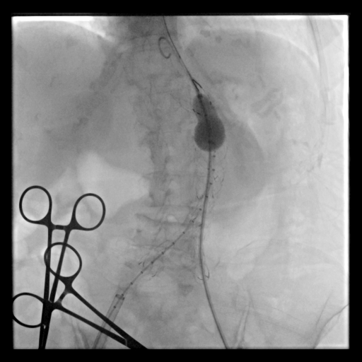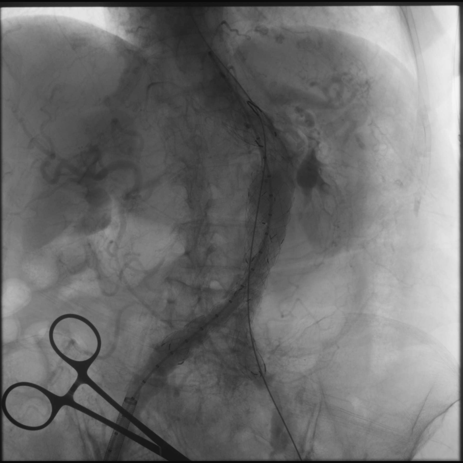 Under general anesthesia, bilateral common femoral arteries were accessed percutaneously under ultrasound guidance, and the pre-close technique with Perclose ProGlide (Abbott Vascular, USA) was applied. Angiography confirmed a large infrarenal AAA and left common iliac artery with severe stenosis (>70%) and marked tortuosity, while the right iliac was relatively straight. Guidewire advancement through the left side was difficult due to narrowing and vessel curvature.